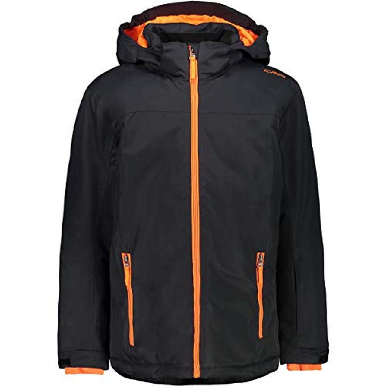 CMP Jungen Snaps Hood SkijackeBergwandern, Schneeschuhwandern, Alpin SkifahrenGeeignet für:KinderKonstruktion:Skijacken, WanderjackenDWR ImprägnierungWassersäule: 5.000 mmAtmungsaktivität (MVTR in 24 h): 5.000 g/mIsolation aus KunstfaserEigenschaften:atmungsaktiv, windabweisend, wasserabweisend, isolierendAusstattung:Reißverschluss: mit KinnschutzSkipasstasche, seitliche Eingrifftaschen mit ReißverschlussKapuze, abnehmbare Kapuze, regulierbare Armabschlüsse, elastische Innenärmel, Weitenregulierung Saum, StehkragenPassform:zur Größentabellezum GrößenberaterMaterial:Außenmaterial: 100% PolyesterInnenmaterial: 100% PolyesterFüllung: 100% PolyesterCMP Kinder Boys Snaps Jacke antracite-orange fluo EU 152Wer im Winter die Zeit gerne im Schnee verbringt, bekommt mit der Boys Snaps Jacke von CMP ein vielseitiges Teil, das zudem auch noch echt cool aussieht.Bei den verschiedenen Prints findet jeder schnell sein bevorzugtes Motiv - und eines haben sie alle gemeinsam: Sie bringen Leben in die Garderobe.Mit ihrem wind- und wasserabweisenden Softshellmaterial sowie einer flachen Wattierung bietet die Jacke einen souveränen Schutz vor den Elementen. Damit fängt sie spritzenden Schnee locker ab und verträgt auch den einen oder anderen Schneeball.Über regulierbare Abschlüsse und die elastischen Innenärmel bleibt die Wärme im Inneren gut erhalten. Eine abnehmbare Kapuze gibt einem zudem die Möglichkeit auf sich ändernde Umstände zu reagieren.
