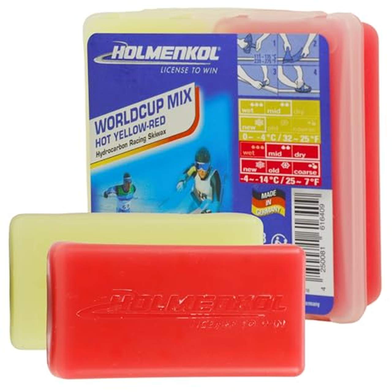 Holmenkol Unisex Erwachsene Worldcup Mix SkiwachsMit dem hochwertigen Basis-, Grund- und Trainingswachs»Worldcup Mix Hot yellow/red« von HOLMENKOL auf Hycrocarbonbasis kannst du die Gleiteigenschaften deiner Ski oder deines Snowboards optimieren. Das zweiteilige Bügelwachs-Set bestehend aus je einem Riegel »Betamix Red« und »Alphamix Yellow« ist einfach in der Handhabung und eignet sich für alle Schneearten und Schneetemperaturen von 0 bis ?14 °C. Inhalt: 2 × 35g.