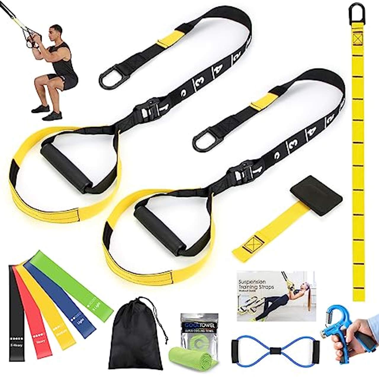 Das AILUKI Schlingentrainer Sling Trainer Set ist eine Marke für langlebige Fitnessgürtel aus hochdichtem Polyester und Gummi. Er kann ein Gewicht von bis zu 508 kg tragen und eignet sich daher für viele verschiedene Workouts. Der Schlingentrainer ist einfach einzurichten und zu bedienen und verfügt über einen verstellbaren Griffriemen, mit dem der Benutzer den Schwierigkeitsgrad durch Veränderung seiner Position erhöhen oder verringern kann. Er verfügt außerdem über eine Verankerung, mit der er an Gegenständen im Freien befestigt werden kann, wodurch er sich für die tägliche Fitness, das Stretching und die Physiotherapie eignet. Darüber hinaus enthält das Set mehrere Zubehörteile wie Widerstandsbänder und ein kühlendes Handtuch, die alle in einer leichten Aufbewahrungstasche verpackt sind. Das macht es ideal für den Gebrauch zu Hause und auf Reisen.