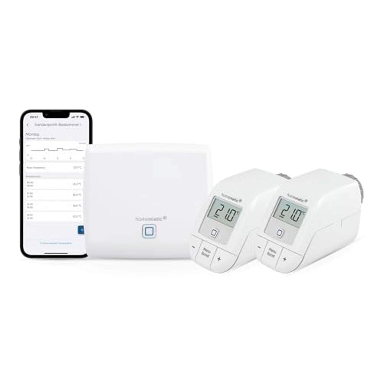 Homematic IP Smart Home Starter Set HeizenKomfortables Heizsystem für zwei Räume – flexibel, intelligent und sicher Dieses praktische Set zur Heizungssteuerung in zwei Räumen sorgt für maximalen Komfort und Energieeffizienz. Es ermöglicht eine flexible und intelligente Heizungssteuerung – jederzeit und von überall. Die perfekte Lösung, um die Temperatur gezielt dort zu regeln, wo sie benötigt wird und gleichzeitig Energiekosten zu sparen. Details des Thermostats Schutzart IP20 Umgebungstemperatur: 0 bis 50 °C Abmessungen (B x H x T): 57 x 68 x 102 mm Gewicht: 185 g (inkl. Batterien) Fenster-Offen-Erkennung per App steuerbar Boost-Modus Eco-Modus Ventilschutzfunktion Bediensperre Details des Access Points gibt die Konfigurationsdaten- und Bedienbefehle vom Smartphone an die Homematic IP-Geräte weiter besonders zuverlässiges IP-Funkprotokoll auf 868/869,25 MHz-Basis hohe Sicherheit dank umfassender AES-Verschlüsselung und Serverstandort in Deutschland geprüfte IT-Sicherheit durch den VDE und das Testinstitut AV-TEST – der Techniker-Verband VDE hat auch das Funkprotokoll auf Informationssicherheit geprüft keine Abfrage persönlicher Daten, außer der IP-Adresse das leuchtende Homematic IP Symbol signalisiert den Betriebszustand (blau, gelb, rot) wird per Netzwerkkabel an einen herkömmlichen Router angeschlossen robustes und wertiges Design bis zu 15 Smartphones/Benutzer pro Homematic IP Installation Steuerung von mehreren Access Points in unterschiedlichen Installationen (z. B. für das Ferienhaus) über eine App Ausbau der Funkreichweite durch Einbindung eines weiteren Access Points Erweiterung und Kombination der Installation mit Homematic IP Wired Geräten über den Homematic IP Wired Access Point möglich komfortable und individuelle Sprachsteuerung (z.B. über Amazon Alexa oder Google Assistant) staatliche Förderung möglich Das im Set enthaltene Heizkörperthermostat Basic bietet eine benutzerfreundliche Bedienung per App, direkt am Gerät oder sogar per Sprachsteuerung. Es ermöglicht die Erstellung von bis zu drei individuellen Heizprofilen mit jeweils 13 Temperaturwechseln pro Tag.So heizen Sie gezielt nur dann, wenn wirklich Bedarf besteht. Eine intelligente Fenster-Offen-Erkennung sorgt zudem dafür, dass beim Lüften keine unnötige Heizenergie verloren geht. In Verbindung mit optionalen Fenster- und Türkontakten wird diese Funktion noch präziser und effizienter.Das Thermostat ist mit einer Überwurfmutter einfach zu montieren, ohne dass in die Heizungsanlage eingegriffen oder Wasser abgelassen werden muss. Es funktioniert auch ohne Zentrale und bietet eine manuelle Konfiguration direkt am Gerät. Wer noch mehr aus seinem Smart Home herausholen möchte, kann das Thermostat über den Homematic IP Access Point problemlos in ein größeres System integrieren.Mit Zusatzfunktionen wie Boost-Modus, Eco-Modus, Ventilschutzfunktion und praktischer Bediensperre ist das Thermostat eine rundum durchdachte Heizlösung, die mit einer Batterielebensdauer von bis zu zwei Jahren und einer Funkreichweite von bis zu 250 Metern überzeugt. Der Access Point ermöglicht die zuverlässige Vernetzung aller Homematic IP Geräte und macht Ihr gesamtes System über eine benutzerfreundliche Smartphone-App steuerbar.Einmal mit dem heimischen Router verbunden, können Sie alle Geräte über die App konfigurieren und verwalten – jederzeit und von überall. Besonders beeindruckend ist die Funkreichweite des Access Points von bis zu 400 Metern im freien Feld, sodass auch Geräte in abgelegenen Gebieten oder im Garten problemlos eingebunden werden können. Der Access Point verwendet ein energiesparendes IP-Funkprotokoll im 868 MHz-Bereich, das nicht nur die Funkbelastung im Haushalt reduziert, sondern auch die Akkulaufzeit der eingebundenen Geräte verlängert.Mit einer Leistungsaufnahme von nur 1,1 Watt ist der Access Point ein sparsamer Begleiter im Alltag. Zusätzlich gibt die mehrfarbige LED-Taste eine visuelle Rückmeldung über den Betriebszustand. Die Installation des Access Points ist einfach und flexibel: Er kann auf dem Tisch aufgestellt oder an der Wand montiert werden.Alles, was Sie für die Inbetriebnahme benötigen, wie Netzwerkkabel, Schrauben und Dübel, ist bereits im Lieferumfang enthalten. Technologie des Thermostats auf den Punkt gebracht Fenster-Offen-Erkennung Diese Funktion erkennt automatisch, wenn ein Fenster geöffnet wird – zum Beispiel durch einen plötzlichen Temperaturabfall. Das Thermostat senkt dann die Heiztemperatur vorübergehend ab, um keine Energie zu verschwenden. Boost-Modus Der Boost-Modus sorgt dafür, dass der Heizkörper für kurze Zeit maximal aufgedreht wird. So wird der Raum schnell erwärmt, z. B. wenn man nach Hause kommt oder morgens das Bad betritt.Eco-Modus Im Eco-Modus wird die Raumtemperatur dauerhaft abgesenkt, um den Energieverbrauch zu reduzieren. Ideal für die Nacht oder wenn niemand zu Hause ist. Ventilschutzfunktion Diese Funktion bewegt das Heizungsventil auch außerhalb der Heizperiode regelmäßig kurzzeitig. So wird verhindert, dass das Ventil verkalkt oder verstopft.Bediensperre Die Bediensperre verhindert, dass Einstellungen am Thermostat versehentlich oder mutwillig verändert werden – besonders praktisch in Haushalten mit Kindern. Im Standard-Lieferumfang enthalten: 2x Homematic IP Heizkörperthermostat Basic 1x Homematic IP Access Point Weitere Sets mit dem Heizkörperthermostat Basic: Homematic IP Starter Set für 3 Räume Homematic IP Starter Set für 4 Räume Homematic IP Starter Set für 5 Räume Dafür steht Homematic IP – Smart-Home-Innovation aus Ostfriesland seit 2015 auf dem Markt und mehrfach als führendes Smart-Home-System in Europa ausgezeichnet entstanden aus der ELV Elektronik AG mit über 40 Jahren Erfahrung in Hausautomation über 3 Millionen Haushalte vertrauen auf mehr als 50 Millionen installierte Geräte zertifizierte Sicherheit und Datenschutz nach VDE- und AV-Test-Standards