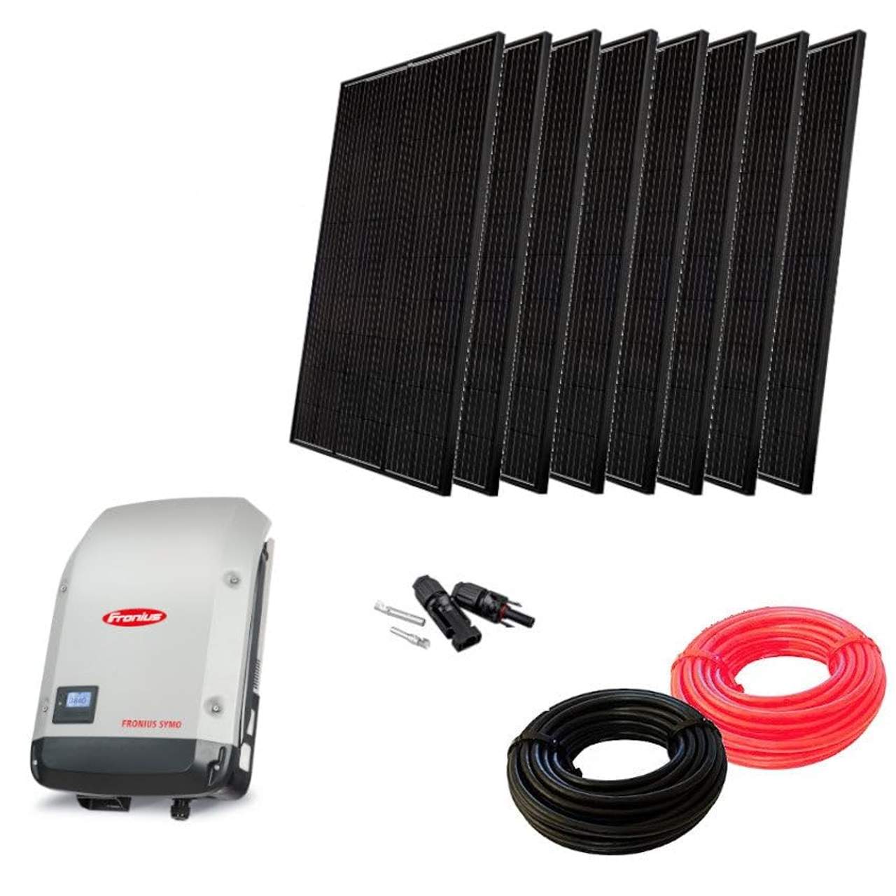 Klimaworld Photovoltaik Komplettanlage 2560WPhotovoltaik Komplettanlage 2560 Watt | inkl. Fronius Symo 3.0-3-M | inkl. Flachdachmontagesystem 1-reihig Photovoltaik Komplettanlage Wie der Name schon andeutet, sind Photovoltaik Komplettanlagen vormontiert und können mit etwas Know-how selbst aufs Dach gebracht werden. Beim Kauf sollten Sie allerdings einige Punkte beachten, damit bei der Montage keine Probleme auftreten.Funktionsweise der Solaranlage: Solaranlagen sind Photovoltaikanlagen, die ihren Strom über eine Steckdose direkt ins Hausnetz einspeisen oder separat auf einer Batterie speichern. Möglichkeiten der Installation: waagerecht, z. B. im Garten, Flachdach, Terrasse schräg, überall durch Aufständerung oder durch Anbringung auf dem Schrägdach senkrecht, z. B. an der Fassade oder Balkonbrüstung Lieferumfang Komplettanlage:8x AS-6M30 Black Frame Module 320 Watt* 1x Wechselrichter Fronius Symo 3.0-3-M PV-Stromkabel 3x2,5 mm² (2 Meter) Solarkabel Rot/Schwarz (20 Meter) 2x MC4 FEMALE KBT4/6II-UR 2x MC4 MALE KST4/6II-UR Dachmontagesystem Dachmontagesystem (im Lieferumfang enthalten) 24x Stockschraube 6x Modulschiene 8x Endklemme für Modulschiene 12x Mittelklemme für Modulschiene 8x Modulschienenverbinder 24x Hammerkopfschrauben Typ 28/15 Solarmodul der Spitzenklasse mit 320 Watt* Das Solarmodul AS-6M30 Black kommen schwarze, monokristalline Zellen mit einer hohen Leistung zum Einsatz. Das dadurch entstandene Modul ist robust, langlebig und hat ein gutes Preis-Leistungs-Verhältnis. Dazu liefert es noch hohe Erträge. Der robuste Aluminiumrahmen und die erstklassige Verarbeitung in einem weitgehend automatisierten Herstellungsprozess gewährleisten eine hohe Zuverlässigkeit und Langlebigkeit der Module.60 zelliges monokristallines Solar-Modul hohe Spitzenleistung 320 Wp (-0/+3 %) je Modul 100 % Elektrolumineszenz-Prüfung Ausgezeichnete Betriebseigenschaften auch bei hohen Temperaturen und schwachem Lichteinfall gutes Schwachlichtverhalten hoher Modulwirkungsgrad von bis zu 19,67 % Maximaler Ertrag auf begrenztem Raum stabiler eloxierter schwarzer Aluminiumrahmen Hochwertige Anschlussdose und Steckersysteme inklusive Kabel (ca. 100 cm) und Stecksystem (IP 67) Positive Leistungstoleranz (0 bis +3 %) Ammoniak- und Salznebelbeständig maximal 5.400 Pa Schneelasten maximal 2.400 Pa Windlast Äußerst zuverlässig dank strenger Qualitätskontrollen Vielfach zertifiziert bspw. durch TÜV NORD Der SYMO 3.0-3-M Wechselrichter (im Lieferumfang enthalten) Mit seiner Leistungsklasse von 3,0 kW ist der Trafolose Fronius Symo ein Leistungsstarker dreiphasiger Wechselrichter für Privathaushalte. Dank dem SuperFlex Design ist der Fronius Symo optimal für verwinkelte oder unterschiedlich orientierte Dächer geeignet. Die serienmäßige Anbindung an das Internet per WLAN oder Ethernet sowie die einfache Integration von Drittanbieter-Komponenten machen den Fronius Symo zu einem der kommunikativsten Wechselrichter am Markt.Zudem ermöglicht die Zählerschnittstelle ein dynamisches Einspeisemanagement und eine übersichtliche Verbrauchsvisualisierung. Dieser Wechselrichter ist vielseitig verwendbar und kann durch das Nachrüsten der Fronius Batterie zum Speicher Wechselrichter mit Notstrom-Funktion gemacht werden. Vorteile im Überblick für Fronius Wechselrichter Symo 3.0-3-M:Snap-In Inverter (Schnelle, einfache und sichere Montage) Smart Grid Ready WLAN Schnittstelle 3phasiger Wechselstrom Trafolos Datalogger und Webserver inkl. DC-Eingangsspannung 150 - 800 V hohe Systemspannung Sehr hoher Wirkungsgrad von bis zu 98 % 2x RS422 (RJ45-Buchse), USB Technische Daten Fronius Wechselrichter Symo 3.0-3-M: 3,0 kVA Leistung 3 Phasen 2 MPP Tracker Klemmanschlüsse RS422 IP65 Abmessungen 645 x 431 x 204 Gewicht 16 kg Bitte beachten: Der Anschluss der Anlage-insbesondere bei höherer Leistung-setzt eine einwandfreie und fachmännische Elektroinstallation im Gebäude voraus!. Durch die integrierte Notfallabschaltung erfüllen die Mini Solaranlagen alle Sicherheitsanforderungen. *Aufgrund der aktuellen Lage am Weltmarkt orientiert sich die konkrete Zusammenstellung der Setbestandteile an deren Verfügbarkeit, wie etwa der Solarmodule. Funktionsumfang und Leistung werden davon nicht beeinträchtigt.