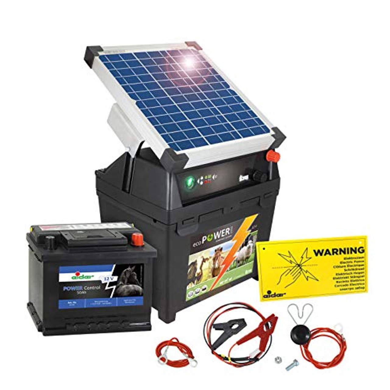 Wenn du das Eider Weidezaungerät ecoPOWER1000-12 Volt kaufst, wird es mit einem umfassenden Satz an Komponenten geliefert. Neben dem Weidezaungerät selbst erhältst du eine Bedienungsanleitung und Sicherheitsrichtlinien, um eine ordnungsgemäße Installation und Nutzung zu gewährleisten. Zum Paket gehören außerdem ein 10-Watt-Solarpanel mit Anschlusskabel, eine 12-Volt-Batterie mit einer Kapazität von 50 Ah zur Energiespeicherung, ein Zaunanschlusskabel, ein Erdanschlusskabel und sogar ein Warnschild vor Elektrozäunen.