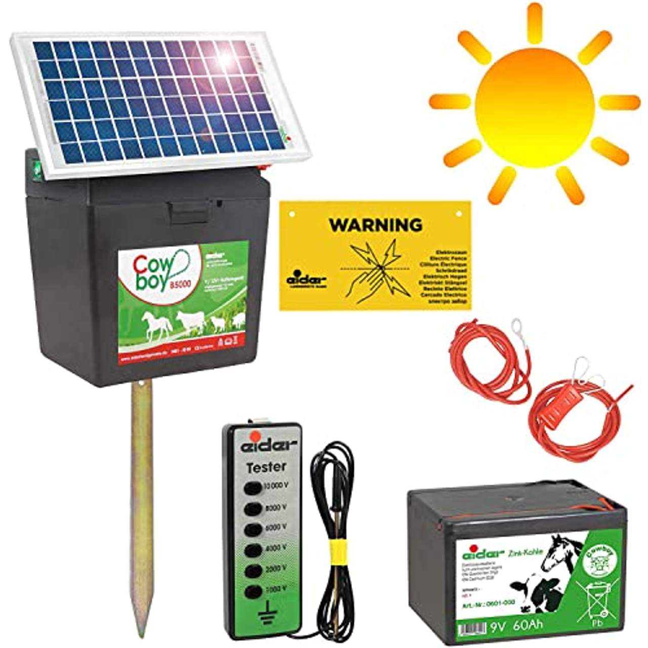 - Umfassendes Set: Das Produkt wird mit einem umfassenden Komponentenset geliefert, das einen 9V/12V/230V/Solar Weidezaungerät Cowboy B5000, ein Solarmodul mit 5 Watt Solarpanel, eine 9 Volt Weidezaunbatterie 60Ah, einen Erdungspfahl, ein Zaunkabel, ein Erdungskabel, ein Warnschild, ein Zauntestgerät und eine Bedienungsanleitung enthält. Das macht es den Kunden leicht, das Gerät schnell aufzustellen und zu benutzen, ohne zusätzliche Artikel separat kaufen zu müssen.
