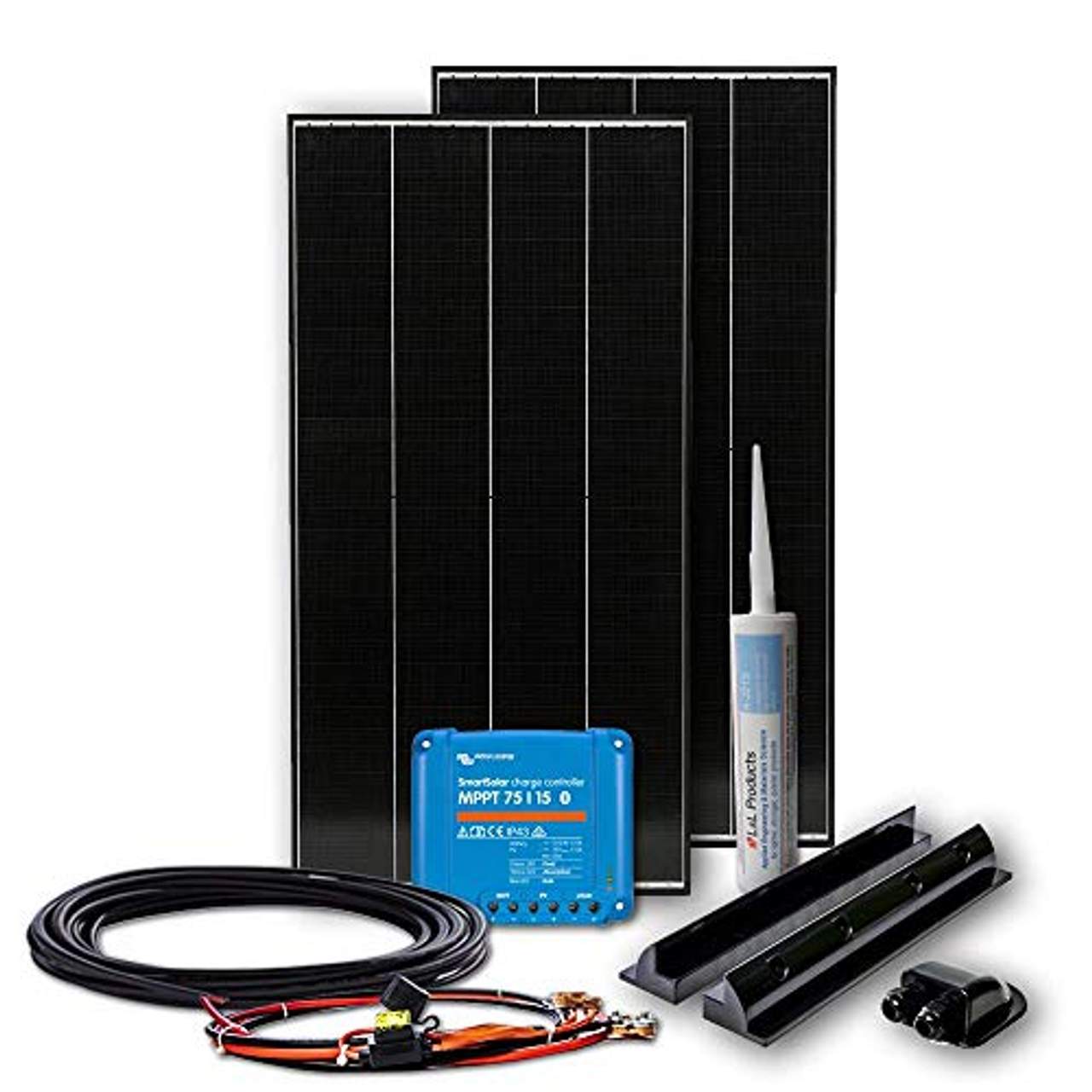 Der komplette Bausatz des WATTSTUNDE Black Line 220W Sets enthält Solarmodule, Montagehalterungen, einen Laderegler mit MPPT-Technologie, Kabel und Stecker. Mit diesen Komponenten kannst du ganz einfach deine eigene Solaranlage für dein Wohnmobil, deinen Camper oder deinen Wohnwagen einrichten.