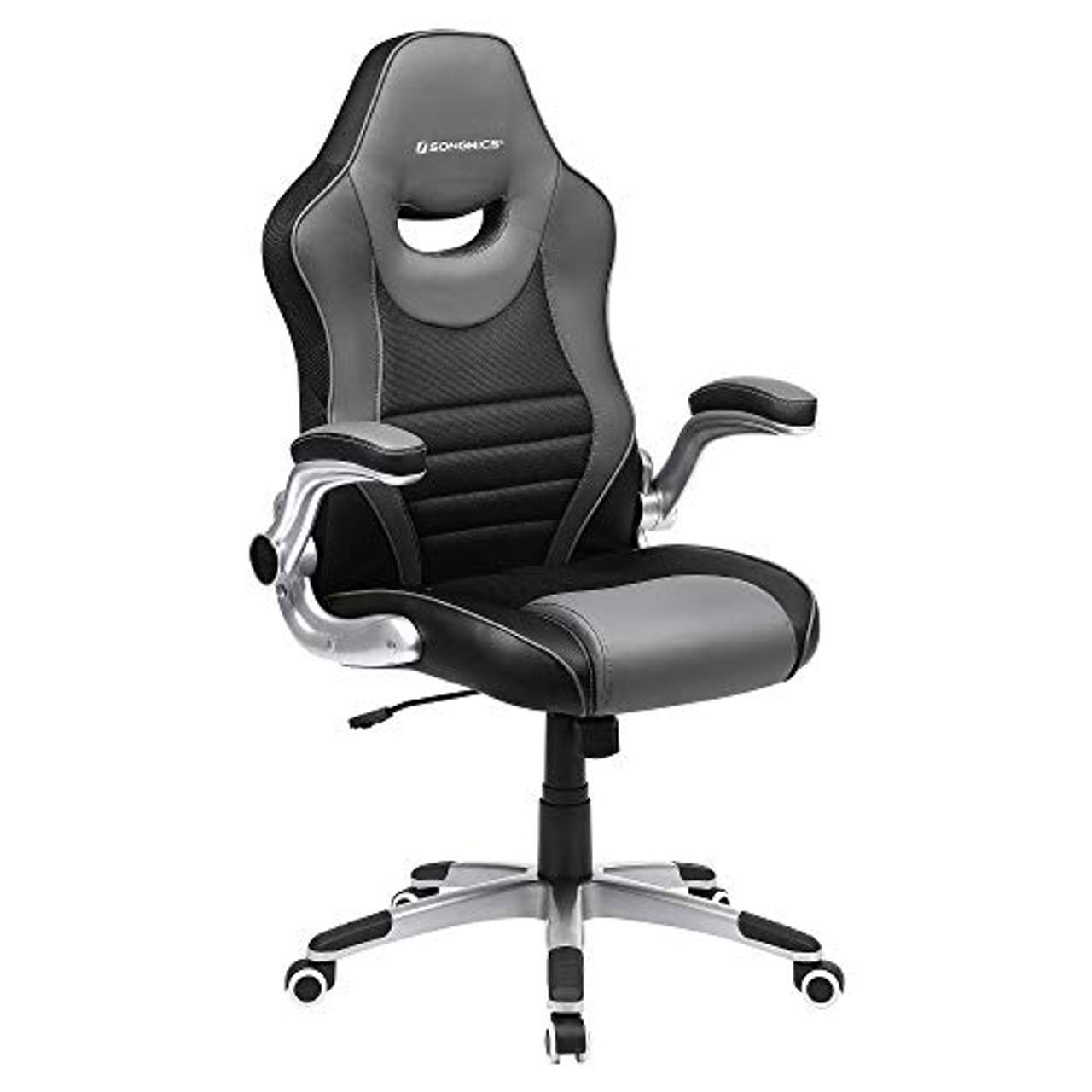 SONGMICS Bürostuhl ergonomischer DrehstuhlSONGMICS Bürostuhl, ergonomischer Drehstuhl, Gamingstuhl mit hochklappbaren Armlehnen, Computerstuhl, Nylon-Sternfuß, max. statische Belastbarkeit 150 kg, fürs Büro, schwarz-grau OBG63BG