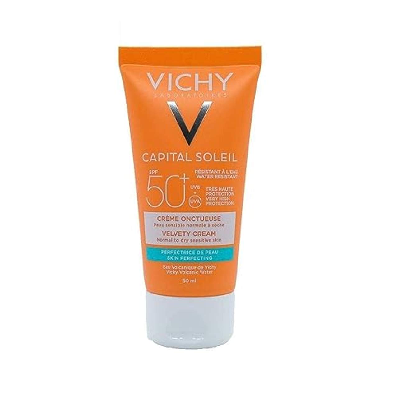 Vichy Gesichts-Sonnencreme Capital Idéal Soleil+ 50 mlAnwendungsgebiet von _Vichy Capital Soleil Gesicht 50+ (Packungsgröße: 50 ml)_Vichy Capital Soleil Gesicht 50+ (Packungsgröße: 50 ml) kann von Ihnen bei den unterschiedlichsten Hauttypen angewendet werden und garantiert Ihnen einen zuverlässigen Schutz vor gefährlichen Sonnenstrahlen - dank des Lichtschutzfaktors 50+.Wirkungsweise von _Vichy Capital Soleil Gesicht 50+ (Packungsgröße: 50 ml)_Vichy Capital Soleil Gesicht 50+ (Packungsgröße: 50 ml) ist eine hautperfektionierende Sonnencreme für Ihr Gesicht. Denn speziell Ihre Gesichtshaut muss vor der intensiven Sonneneinstrahlung geschützt werden, da diese sehr empfindlich ist.Die Vichy Capital Soleil Gesicht 50+ (Packungsgröße: 50 ml) kann von Männern und Frauen gleichermaßen verwendet werden. Auch der Hauttypus, ob heller, normaler oder trockene Hautteint spielt bei Vichy Capital Soleil Gesicht 50+ (Packungsgröße: 50 ml) dabei keine Rolle, da Vichy Capital Soleil Gesicht 50+ (Packungsgröße: 50 ml) für alle Hauttypen geeignet ist.Vichy Capital Soleil Gesicht 50+ (Packungsgröße: 50 ml) ist mit seinem intensiven Lichtschutzfaktor 50+ und seiner sehr hohen feuchtigkeitsspendenden Schutzwirkung über 24 Stunden, ideal für hohe Strahlenbelastungen auf Ihrem Gesicht. Denn Vichy Capital Soleil Gesicht 50+ (Packungsgröße: 50 ml) ist reich an Hyaluronsäure. Außerdem ist Vichy Capital Soleil Gesicht 50+ (Packungsgröße: 50 ml) besonders hypoallergen und ohne Parabene.Vichy Capital Soleil Gesicht 50+ (Packungsgröße: 50 ml) von der Firma Vichy garantiert Ihnen die passende Sonnenschutzpflege für jeden Hauttyp u