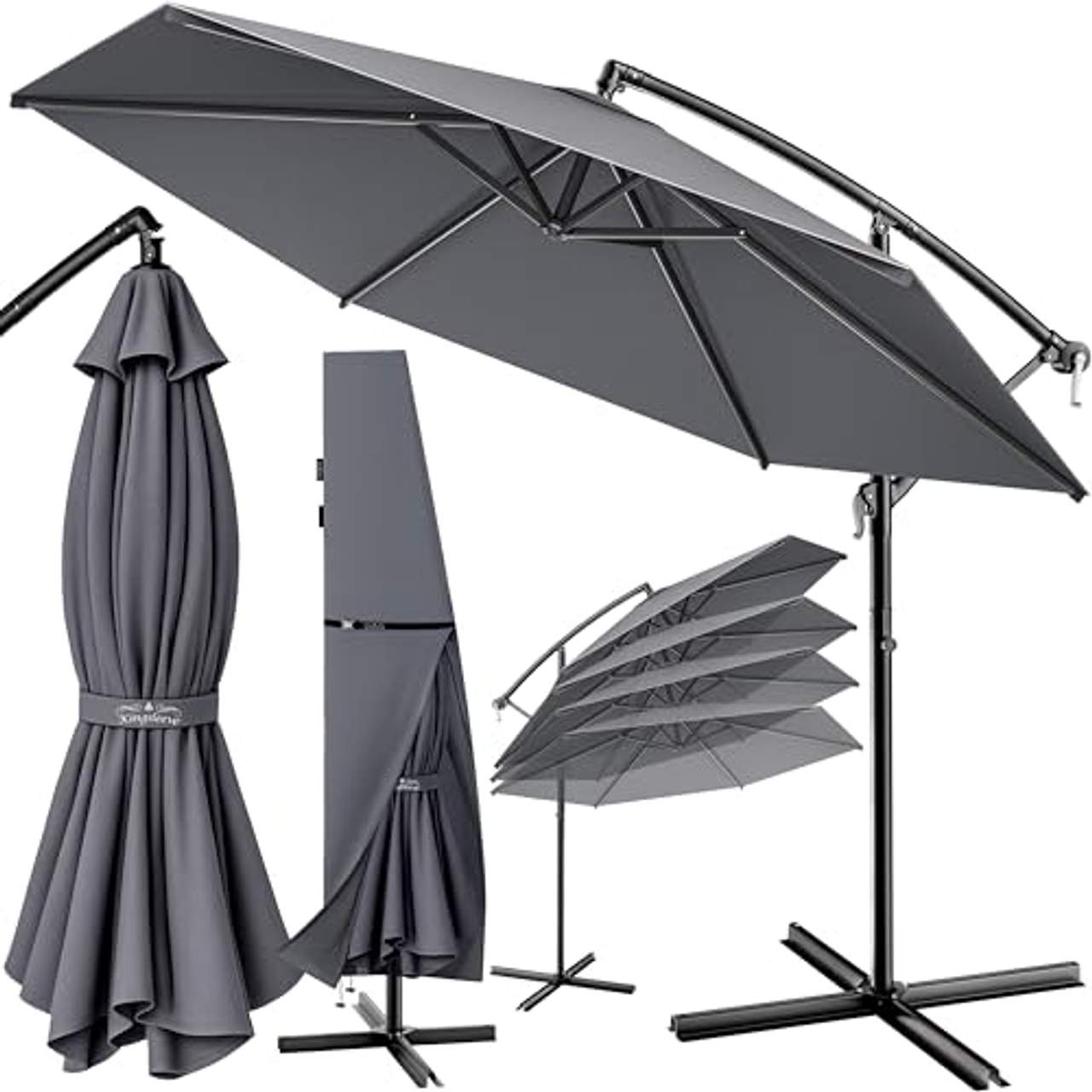 Der Deuba Ampelschirm ist ein Ampelschirm, den es in zwei Größen gibt (Ø 330cm oder 300cm). Er hat einen robusten, rostfreien Aluminiummast und einen Kurbelmechanismus zum einfachen Öffnen und Verstellen. Das Sonnendach ist wasserabweisend und der Schirm kann in verschiedenen Winkeln eingestellt werden, um optimalen Schatten zu spenden. Die Basis des Schirms muss für zusätzliche Stabilität mit Gewichten beschwert werden. Außerdem verfügt der Schirm über einen Riemen mit Klettverschluss, der bei Nichtgebrauch kompakt verschlossen werden kann.