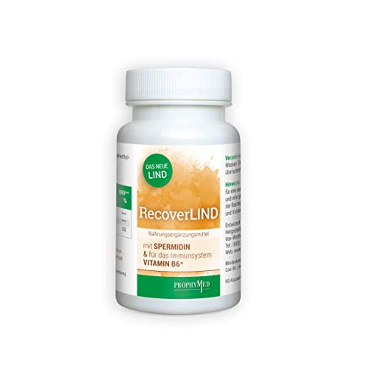 RecoverLIND Spermidin Kapseln hochdosiertNahrungsergänzungsmittel sind kein Ersatz für eine abwechslungsreiche und ausgewogene Ernährung und gesunde Lebensweise RecoverLIND Wissenschaftlich Bewiesen · Vitamin B6 unterstützt die normale Funktion des Immunsystems & sorgt für eine normale Immunantwort im Bedarfsfall Hervorragendes Preis-Leistungsverhältnis · RecoverLIND verzichtet vollkommen auf billige Zusatzstoffe zur Kapselfüllung. Deshalb stehen die eigentlichen Inhaltsstoffe dem Nutzer in maximaler Dosierung zur Verfügung. Premium Rohstoffe · Reine Natur. Neben Vitamin B6 als notwendigem Starter enthält es nur Spermidin, Spermin & Putrescin. Diese Eiweiße werden für RecoverLIND mittels eines patentgeschützten Spezialverfahren aus hochwertigem Soja gewonnen & können so zusammen mit Vitamin B6 die normalen immunrelevanten Körperfunktionen unterstützen Frei VON Unerwünschten Zusatzstoffen · 100% vegan, laktosefrei, glutenfrei, ohne Gentechnik Hergestellt IN Deutschland · in streng geprüften Anlagen & in kleinem eigenständigem Betrieb Spermidin ist ein biogenes Amin. Eine seiner Funktionen im Zellstoffwechsel ist die Zellreinigung. Putrescin ist ebenfalls ein biogenes Amin & ein Wachstumsfaktor bei der Zellteilung. Spermin, ebenfalls ein biogenes Amin. RecoverLIND ist ein Nahrungsergänzungs- & kein Arzneimittel. Deshalb ist es bei Erkrankungen nicht aus sich selbst heraus wirksam. Bei ausdrücklicher ärztlicher Empfehlung kann es aber, wie gesunde Ernährung allgemein, unterstützen. Zutaten: Sojaextrakt, enthält 0,27% Polyamine davon 0,2% Spermidin, 0,021% Putrescin & 0,22% Spermin, Hydroxypropylmethylcellulose (Kapselhülle), Vitamin B6 Nährwerte: Durchschnittliche Nährwerte: pro Tagesdosis: Spermidin 1 mg Polyamine 1,3 mg Vitamin B6 0,7 mg Verzehrempfehlung: 1 Kapsel täglich mit ausreichend Flüssigkeit einnehmen. Hinweis: Die angegebene empfohlene tägliche Verzehrmenge darf nicht überschritten werden. Aufbewahrung: Kühl (6-25 °C) und lichtgeschützt lagern. Außerhalb der Reichweite von Kindern aufbewahren. Nettofüllmenge: 60 Kapseln Herstellerdaten: Bugslock Austria 2.4, Schuhfabrikgasse 17 1230 Wien Österreich
