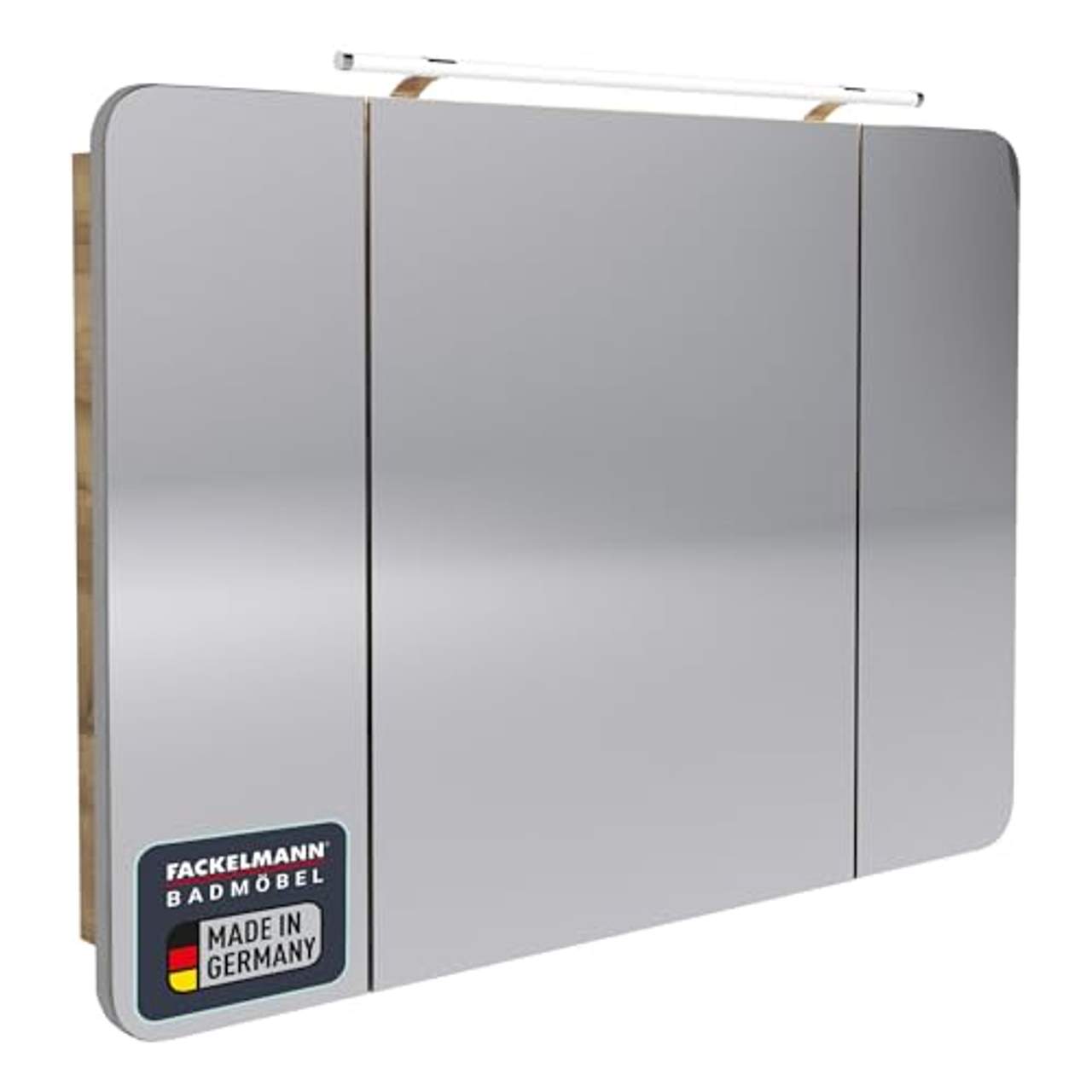 FACKELMANN LED Spiegelschrank MilanoDie Natürlichkeit der markanten Eiche, glänzend weiße Fronten, hochwertige Waschtische aus Keramik…FACKELMANN setzt mit dem Badmöbel-Programm MILANO starke Akzente. Und dabei spielt keine Rolle ob es um die Einrichtung eines Gästebades in 55 cm Breite oder einen kompletten Waschplatz in 90 cm oder 110 cm Breite geht.Im Mittelpunkt steht stets der DesignWaschtisch aus weißer Keramik, der mit der eindrucksvollen, konischen Silhouette bleibenden Eindruck vermittelt. Zusätzliche Unterstützung erfährt diese Optik durch den optionalen Einbau von Contura Light, einer LED-Beleuchtung unter dem Waschtisch. Dies leuchtet auch in die WaschtischUnterschränke mit 2 Türen (52 cm breit) oder 2 Schubladen mit Selbsteinzug (80 oder 100 cm breit), die genügend Stauraum direkt am Waschplatz bieten. Zusatzmöbel wie Hängeschrank, Unterschrank, Midi- und Doppelmidi-Schrank sowie ein Hochschrank helfen diesen je nach Raumgröße passend zu erweitern. Auf allen Schränken setzen hochwertige Griffe aus chromglänzendem Metall (im Lieferumfang enthalten) weitere Highlights.Als praktisches Accessoire kann ein faltbarer Wäschekorb aus Leinen u.a. in den 60cm breiten Doppelmidi-Schrank integriert werden. Bei den Möbel-Dekoren hat sich FACKELMANN für die wohnliche Ast-Eiche und das klassische Weiß entschieden. In den angebotenen Kombinationen von Korpus und Front Ast-Eiche /Ast-Eiche, AstEiche/Weiß und Weiß/Weiß findet jeder Kunde seinen Favoriten. Weitere Schmuckstücke sind über dem Waschtisch zu finden. Der LED-Spiegelschrank in 90 und 110 cm Breite ist mit den gerundeten Spiegeltüren in der Optik perfekt an die Beckengeometrie angepasst. Die Anordnung der 3 überstehenden Türen gestattet nicht nur ein einfaches, griffloses Öffnen sondern auch den 3D-Effekt für eine 360° Betrachtung im Spiegel und damit einen optimalen Stylingkomfort. Die Ambientebeleuchtung unter dem Spiegelschrank und eine LED-Aufsatzleuchte inszeniert den Waschplatz in harmonischem Licht.Eine elegante Alternative stellt das LED-Spiegelelement mit abgerundeten Kanten an der Oberseite und der Dekor-Satinierung dar.