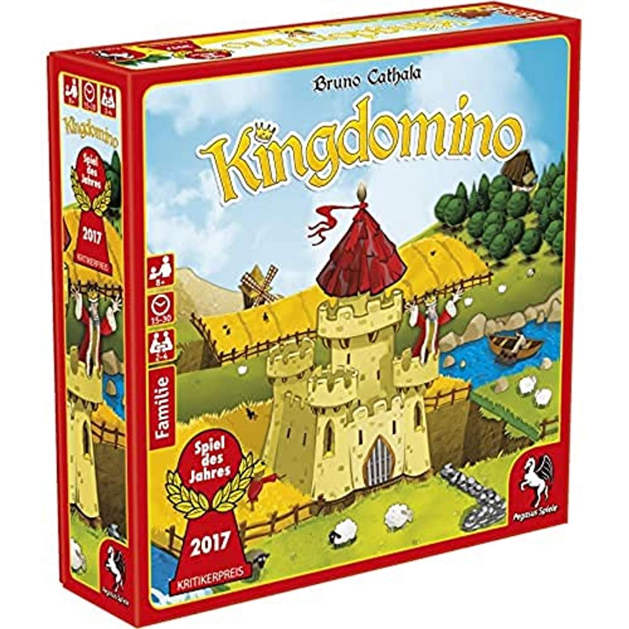 Kingdomino Spiel des Jahres 2017Kingdomino ist ein schnelles Familienspiel ab 8 Jahren mit einfachen Regeln, die auf dem beliebten Spielprinzip von Domino beruhen. 48766294_scre_3.jpg Inhalt 48 Dominosteine 4 Startsteine 4 3D-Schlösser (4-teilig) 8 Holzfiguren 1 3D-Turm 1 Wertungsblock 1 Anleitung Spielidee Als Herrscher eines Königreichs machen sich die Spieler auf die Suche nach Ländereien, um ihr Reich zu vergrößern. Es gilt, zum richtigen Zeitpunkt der richtigen Länderei habhaft zu werden. Dann steht dem Erbau des prestigeträchtigsten aller Königreiche nichts mehr im Wege!Je größer die verschiedenen Ländereien sind und je mehr Häuser sich in ihnen befinden, desto mehr Prestigepunkte gibt es am Spielende dafür. Doch ist der Spieler in der einen Runde zu gierig, haben die Mitspieler in der nächsten Runde die bessere Auswahl.Manchmal lohnt es sich daher auch, auf ein paar Punkte zu verzichten und den Rivalen eine Länderei vor der Nase wegzuschnappen, die sie viel dringender brauchen.Geschicktes Anbauen und ein wachsames Auge auf die Königreiche der Mitspieler sind hier der Schlüssel zum Sieg!48766294_scre_4.jpg Ziel des Spieles Jeder lässt vor sich sein eigenes Königreich entstehen – 5x5 Felder groß. Ziel dabei ist es, möglichst große Gebiete aus jeweils einem Landschaftstyp mit wertvollen Gebäuden zu bilden. Überlegt daher gut, welche Dominosteine ihr wählt. Bei Steinen mit niedriger Zahl kommt ihr zwar früher an die Reihe, diese weisen aber keine wertvollen Gebäude auf.48766294_scre_5.jpg