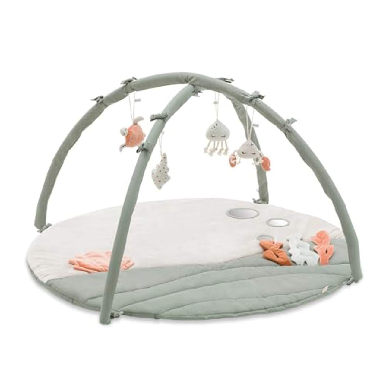 | Highlights | Spielbogen mit Überraschungseffekt - Spiegeln, rasseln, quietschen: Reize für die Sinne. In Muscheln aus Stoff, die auf der Spieldecke aufgenäht sind, kannst du Spieltiere verstecken und dein Baby damit überraschen. Außerdem knistern die Algen - das gefällt deinem Baby bestimmt. Einfach waschbar bei 30 Grad |