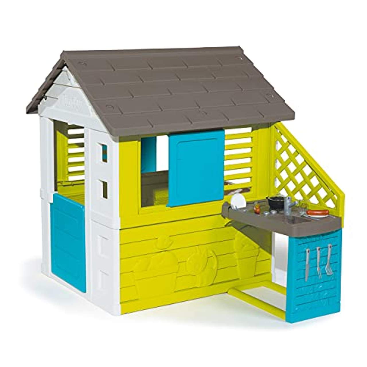 Smoby 810711 Pretty SpielhausDas stabile, farbenfrohe Pretty Haus bietet mit seiner tollen Sommerküche viel Spielspaß für die Kleinen. Die an der Außenwand befestigte Spielküche verfügt über eine Spüle mit Wasserhahn (nicht funktionsfähig), eine Barbecue-Grillplatte zum Kochen und Grillen sowie eine Geschirrablage.Vervollständigt wird das Koch-Erlebnis durch 2 Gläser, 2 Teller, verschiedene Küchenhelfer, Würstchen und einen kleinen Topf. Im Inneren bietet das Spielhaus viel Platz zum Spielen und Verstecken. Dank des besonderen Fertigungsverfahrens ist es kinderleicht zu montieren und besonders stabil. Die angesagte Farbgebung in türkis und grün gibt dem Gartenhäuschen ein frisches und modernes Äußeres.Die vier robusten Seitenwände sind detailreich gestaltet, Schmetterlinge und eine kleine Katze zieren die Fassade und sorgen für ein lustiges Design. 2 Fenster mit Lamellen, 2 Schiebefenster zum Auf- und Zuschieben sowie eine kleine Eingangstüre ergänzen die Ausstattung des Hauses. Hergestellt aus hochwertigem, UV-stabilem Kunststoff ist das Pretty Haus von Smoby besonders widerstandsfähig gegen Wettereinflüsse und Ausbleichung. Details: Produktmaße: 145 x 110 x 127 cm Spielküche verfügt über eine Spüle mit Wasserhahn (nicht funktionsfähig), eine Barbecue-Grillplatte zum Kochen und Grillen sowie eine Geschirrablage Zubehör: 2 Gläser, 2 Teller, verschiedene Küchenhelfer, Würstchen und einen kleinen Topf Alter: ab 2 Jahren Über Smoby: Als einer der bekanntesten französischen Spielzeughersteller weiß Smoby Toys, was Kinder glücklich macht und Eltern zufrieden - innovative Spielzeuge, die den Kleinen dabei helfen, die eigenen Fähigkeiten zu entdecken und zu trainieren, fröhlich-bunt und voller Ideen. Denn Kinder sind geborene Entdecker! Sie begreifen und erleben die Welt durch Spielen und Ausprobieren. Deshalb ist altersgerechtes, sicheres Spielzeug so wichtig.Smoby Toys ist Experte für geprüftes Spielzeug auf dem neuesten Stand der pädagogischen Forschung, vom Baby bis zum Einschulungsalter. Das Wichtigste ist jedoch: Mit Smoby Produkten spielen, macht einfach so richtig Spaß!