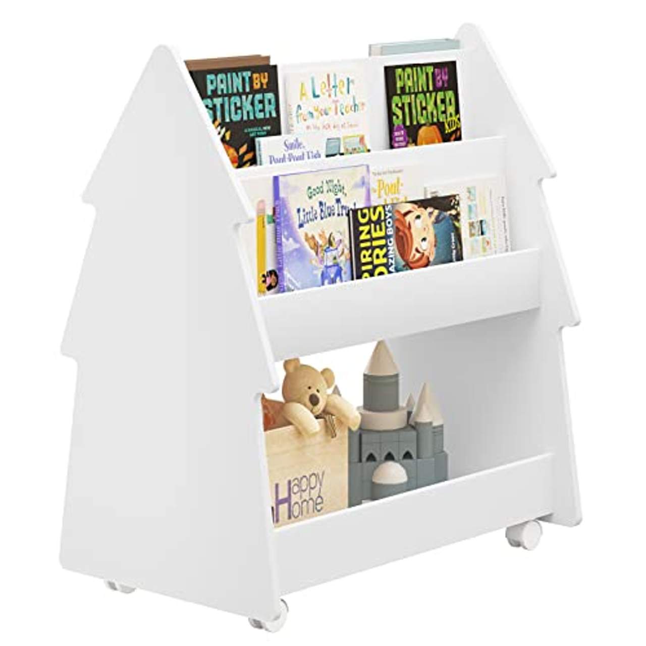 WOLTU 2 Seitiges Kinder BücherregalHighlights 2-SEITIGES BÜCHERREGAL: Das 3-stöckige Kinderzimmermöbel zeigt Bücher mit Einbänden auf beiden Seiten, sodass die Kinder auf einen Blick finden können, was sie wollen. Das untere Fach kann Spielzeug oder andere Gegenstände aufnehmenMIT ROLLEN: Das Montessori-Bücherregal mit 4 Lenkrollen ist auch für die Kinder selbst leicht zu bewegen und fördert ihre Organisationsfähigkeit. 2 Rollen sind gebremst, sodass es auch möglich ist, das Bücherregal an einem festen Ort anzuhaltenMASSGESCHNEIDERT FÜR KINDER: Dieses niedliche Bücherregal in Form eines Weihnachtsbaums mit den Maßen 60x71x38,5 cm ermöglicht es Kindern, Bücher selbständig zu finden und zu erreichen, was ihre Neugierde und Leseleidenschaft anregtSICHER &, ROBUST: Das E1-MDF mit hochwertigem Lack schafft Kindern ein solides, stabiles und ungiftiges Bücherregal mit einer glatten, wasser- und kratzfesten Oberfläche. Außerdem sind alle Kanten für mehr Sicherheit abgeschrägtMONTAGE &, PERSONALISIERUNG: Das kleine Bücherregal mit ausführlicher Anleitung und Zubehör ist leicht zu montieren. Sie können es individuell gestalten, indem Sie die weiße Oberfläche mit Farben und Zeichnungen bemalen, auch von den Kindern selbst Technische Daten Material MDF:der Klasse E1Farbe: WeißGesamtabmessungen: 60 x 71 x 38,5 cm (B x H x T)(Für weitere Details zu den Abmessungen: sehen Sie Bilder)Gewicht: ca. 11,9 kgTragfähigkeit: Oberes einseitiges Fach: 5 kg, unteres Fach: 10 kg Lieferumfang 1x Bücherregal für Kinder1x Gebrauchsanweisung1x Zubehörset Info zu diesem Artikel Anti-Fall-Paneele: Alle Fächer haben Frontplatten, die das Verrutschen und Herabfallen von Dingen verhindern und eine bessere und sicherere Organisation ermöglichen.Leicht zu bewegen &, anzuhalten: Dank der 4 Rollen (2 davon mit Bremse) lässt sich dieses Kindermöbel überall bequem bewegen, auch von den Kindern selbst. Mehr Stauraum: Die 3-stufige Struktur mit Ablagefächern auf beiden Seiten bietet mehr Platz für Bücher und Spielzeug, was verschiedene Bedürfnisse befriedigt.Form eines Weihnachtsbaums: Der hübsche Look zieht die Kinder auf sich und regt sie dazu an, selbst nach Büchern zu suchen und zu lesen, damit sie die Freude am Lesen entdecken. Im Wachstumsprozess von Kindern sind Bücher ein guter Wegbereiter und Spielzeuge eine hilfreiche Freude mit ihnen.Nach dem Lesen oder Spielen eigene Sache rechtzeitig zu organisieren und daraus gute Gewohnheiten in Bezug auf Organisation und Lagerung früh einzuführen, haben eine lebenslange Wirkung auf die Kinder.Das WOLTU Kinderregal hat eine kindgerechte Größe.Die mehrschichtige Konstruktion bietet viel Stauraum. Die ansprechende Optik sorgt dafür, dass sich Kinder in es verlieben. Lassen Sie Ihr Kind die Initiative ergreifen, seine Sachen einzupacken. Das Kinderregal hilft Kindern, gute Gewohnheiten der Aufbewahrung und Kategorisierung zu entwickeln.WOLTU Hinweise Durch die manuelle Bestimmung der Maße kann eine Abweichung von 1 bis 2 cm vorliegen.Aufgrund der Lichtverhältnisse bei der Produktfotografie und unterschiedlichen Bildschirmeinstellungen kann es dazu kommen, dass die Farbe des Produktes nicht authentisch wiedergegeben wird.