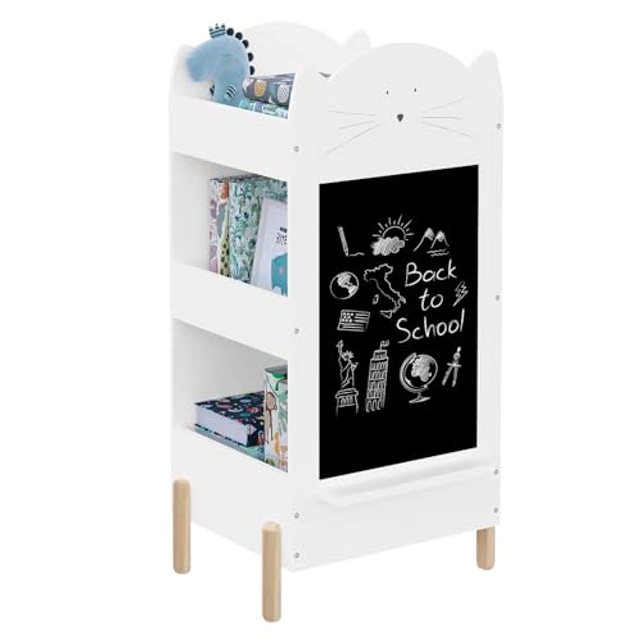 - Kreatives Spielen: Die einzigartige Katzenform des "WOLTU Kinder Bücherregals mit 3 Ablagen" verfügt über eine Kreidetafel mit einem Kreidetablett, das die Aufmerksamkeit der Kinder auf sich zieht und zu fantasievollem Spiel anregt. Dieses interaktive Element ermutigt die Kinder, sich künstlerisch auszudrücken, indem sie auf der Tafel malen oder schreiben, was die Kreativität und die Feinmotorik fördert. Durch die Integration eines Raums für kreativen Ausdruck in eine Aufbewahrungseinheit verwandelt dieses Produkt ein gewöhnliches Bücherregal in einen multifunktionalen Spielbereich, der spielerisch zum Lernen anregt.