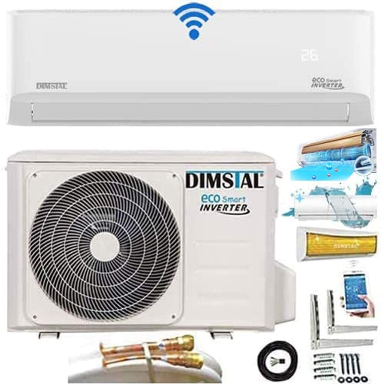 Der „QuickConnect 9000 BTU ECO Smart Inverter 2,6kW“ ist eine Split-Klimaanlage mit einer Kühlleistung von 2,5 kW. Sie trägt den Markennamen „DIMSTAL“ und bietet mehrere wichtige Funktionen. Erstens hat sie einen Super-Ionisator, der dafür sorgt, dass die Luft in den Räumen so rein ist wie in einem Wald. Zweitens verfügt er über die Follow Me-Funktion, die eine individuelle Temperaturregelung ermöglicht, indem sie den Standort der Fernbedienung erkennt. Drittens verfügt er über eine Self-Clean-Selbstreinigungsfunktion, die für Sauberkeit und Hygiene sorgt. Und schließlich ist er mit Quick-Connect-Schnellanschlusskabeln und einem WiFi-Modul ausgestattet, die eine einfache Installation und Fernsteuerung über eine kostenlose App ermöglichen. Außerdem verfügt er über eine energieeffiziente Kühlung mit der Einstufung A++ und verwendet die neueste Generation von Quick Screw-Kanälen für mehr Komfort.