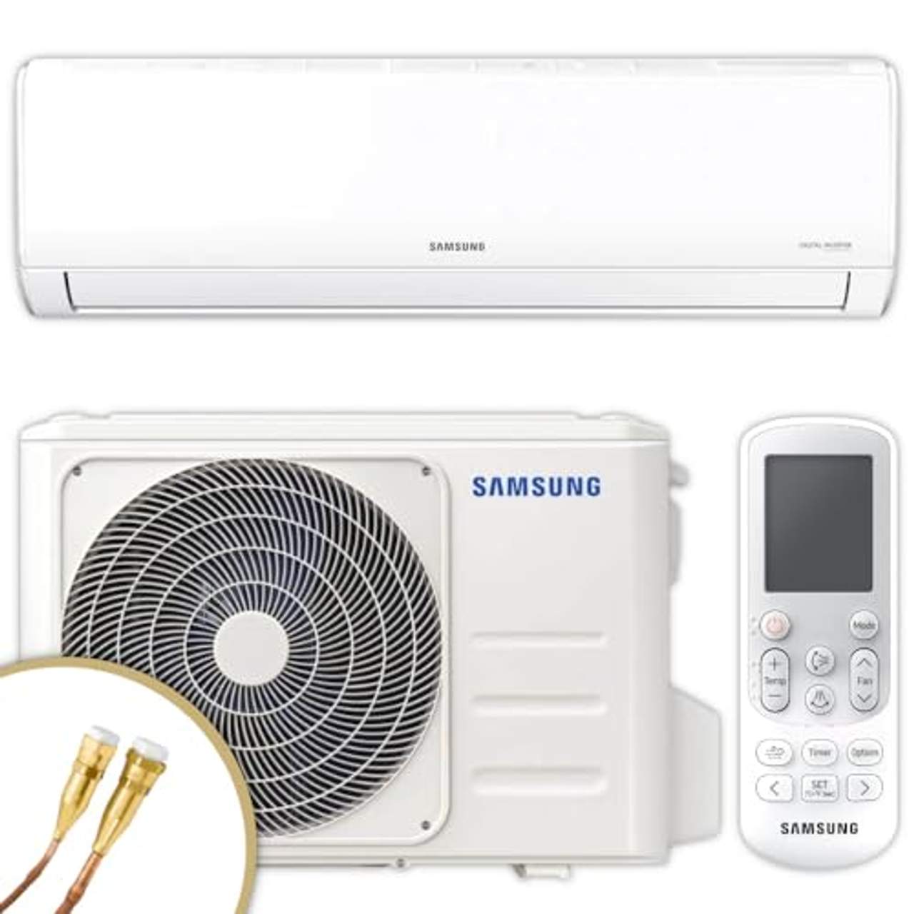 ThermoFlux Samsung Split Klimaanlage Quick ConnectLeise Klimaanlage mit Heizfunktion: Das Samsung AR3500 Klimaanlagen-Set Wandgerät AR18BXHQASINEU und Außengerät AR18BXHQASIXEU mit 5,2 kW für einen Raum bis ca. 55 m². Schneller Anschluss dank Quick-Connect. Mit dem Klimaanlagen-Set AR3500 von Samsung zieht moderne Klimatechnologie in Ihr Zuhause oder Büro ein. Das System, das aus einem leistungsstarken Wandgerät und einem zuverlässigen Außengerät besteht, sorgt ganzjährig für ein angenehmes Raumklima.Dank seines durchdachten Designs und seiner smarten Technik fügt sich das AR3500-Set dezent in jede Umgebung ein und bietet ein Plus an Luftqualität und Energieeinsparung. Details des AR3500 Wandgeräts leiser Betrieb durch Digital Inverter Full HD-Filter gegen Staub und Pollen antibakterieller Wärmetauscher Selbstreinigungsfunktion gegen Schimmelbildung 4-in-1 Funktion:Kühlen, Heizen, Entfeuchten, Lüften Good Sleep Modus für erholsamen Schlaf ohne WiFi, ohne App-Steuerung Details des AR3500 Außengeräts effizienter Digital Inverter Kompressor kompakt für flexible Außenmontage robustes, wettergeschütztes Gehäuse umweltfreundliches R32-Kältemittel Das Wandgerät AR3500 von Samsung sorgt das ganze Jahr über für ein angenehmes Raumklima.Ob kühlen, heizen, entfeuchten oder ventilieren, die AR3500 bietet vier Betriebsmodi, die sich dank des automatischen Moduswechsels von selbst anpassen. Das spart Energie und erhöht den Bedienkomfort. Ein effizienter 8-poliger Digital Inverter sorgt für einen besonders geräuscharmen Betrieb, indem er die Temperatur konstant hält, ohne dass die Anlage häufig ein- und ausgeschaltet werden muss.So wird der Geräuschpegel niedrig gehalten und der Stromverbrauch reduziert. Das Gerät ist mit einem antibakteriell und antiallergen beschichteten Wärmetauscher sowie einem Full-HD-Filter ausgestattet, der selbst feinste Staubpartikel und Pollen aus der Luft filtert. Insbesondere Allergiker profitieren so von spürbar sauberer Raumluft.Die Selbstreinigungsfunktion verhindert Schimmelbildung im Inneren der Anlage und sorgt für einen hygienischen Dauerbetrieb. Praktische Zusatzfunktionen wie der „Good Sleep Mode”, der für ein optimales Schlafklima sorgt, oder der integrierte 24-Stunden-Timer mit Infrarotfernbedienung erleichtern die tägliche Nutzung. Bei Bedarf kann die Anlage mit einer optionalen Kabelfernbedienung erweitert werden, die erweiterte Steuerungsoptionen wie Echtzeit-, Tages- und Wochenzeitschaltung sowie einen Raumtemperaturfühler bietet.Mit Funktionen wie Auto-Restart, drei Ventilatorstufen und einer schwenkbaren Luftausgabe nach oben und unten erfüllt die Samsung AR3500 höchste Komfortansprüche im Alltag. Dank des unsichtbaren Luftansaugs und der kompakten Bauform bleibt sie optisch dezent im Hintergrund.Das Außengerät AR3500 von Samsung bietet eine zuverlässige Kühl- und Heizleistung. Es arbeitet mit dem umweltfreundlichen Kältemittel R-32, erfüllt gängige Effizienzstandards und sorgt so nicht nur für ein angenehmes Raumklima, sondern hilft auch, Strom zu sparen.Dank der Digital-Inverter-Technologie passt sich der Kompressor flexibel an den tatsächlichen Leistungsbedarf an, was für gleichmäßige Temperaturen und einen ruhigen Betrieb mit minimalen Schwankungen sorgt. Das robuste Gehäuse schützt das Innenleben zuverlässig vor Witterungseinflüssen, während der optimierte Luftstrom für eine effektive Wärmeabfuhr sorgt.Die Außeninstallation gelingt unkompliziert, da das AR3500 mit kompakten Abmessungen punktet und sich nahtlos an die AR3500 Samsung-Innengeräte anschließen lässt. Auch bei wechselnden Wetterbedingungen zeigt sich das AR3500 leistungsstark und zuverlässig. Die automatische Wiederanlauffunktion sorgt bei Stromausfällen für einen reibungslosen Neustart.Außerdem arbeitet das Außengerät effizient bis zu bestimmten Außentemperaturgrenzen, sowohl im Kühl- als auch im Heizmodus. Das Set ist auch ohne Quick-Connect-System erhältlich. Technologie des AR3500 Klimaanlagen Sets auf den Punkt gebracht ECO Digital Inverter Der energiesparende Inverter passt die Leistung effizient an den tatsächlichen Bedarf an.Das spart Strom und sorgt für gleichmäßige Temperaturen ohne häufiges Ein- und Ausschalten. Selbstdiagnosesystem Erkennt Störungen automatisch und zeigt sie zur schnellen Fehlerbehebung an. Antibakteriell/antiallergie beschichteter Wärmetauscher Dieser spezielle Wärmetauscher hemmt das Wachstum von Keimen und Allergenen auf der Oberfläche und verbessert so die Luftqualität. Neustart nach Stromausfall Nach einem Stromausfall startet das Klimagerät automatisch mit den vorherigen Einstellungen. Full HD-Filter 60 „HD“, weil seine hohe Filterleistung mit der Klarheit eines Full-HD-Bildes verglichen wird.Auto-Air-Swing up & down, links & rechts manuell Die Luft wird automatisch verteilt, um den Raum gleichmäßig zu kühlen. Unsichtbarer Luftansaug Die Luftzufuhr ist elegant im Gerät verborgen und sorgt für ein aufgeräumtes Erscheinungsbild. Automatischer Moduswechsel Wechselt selbstständig zwischen Kühl- und Heizfunktion – je nach Raumtemperatur. Good Sleep Funktion Regelt die Temperatur nachts automatisch für besseren Schlafkomfort. Im Standard-Lieferumfang enthalten: Samsung Außengerät AR3500 AR18BXHQASIXEU mit 5,2 kW Samsung Wandgerät AR3500 AR18BXHQASINEU mit 5,2 kW Infrarotfernbedienung 5 m 1/4’’ QUICK-CONNECT Flüssigleitung 5 m 3/8’’ QUICK-CONNECT Gasleitung 2x Kupplungshälften Klimaanlage Anschluss IG 1/4’SAE 2x Kupplungshälften Klimaanlage Anschluss IG 3/8’SAE Service: Evakuieren und/oder befüllen von Split-Klima Inneneinheiten 6 m Kommunikationsleitung 5x1,5 mm² Optional wählbar: Kondensatabführung Montagezubehör Außeneinheit Dafür steht Samsung – Innovation und Qualität für moderne Klimalösungen Technologieführer: Samsung ist seit Jahrzehnten ein globaler Vorreiter in der Entwicklung intelligenter Elektronik und bringt diese