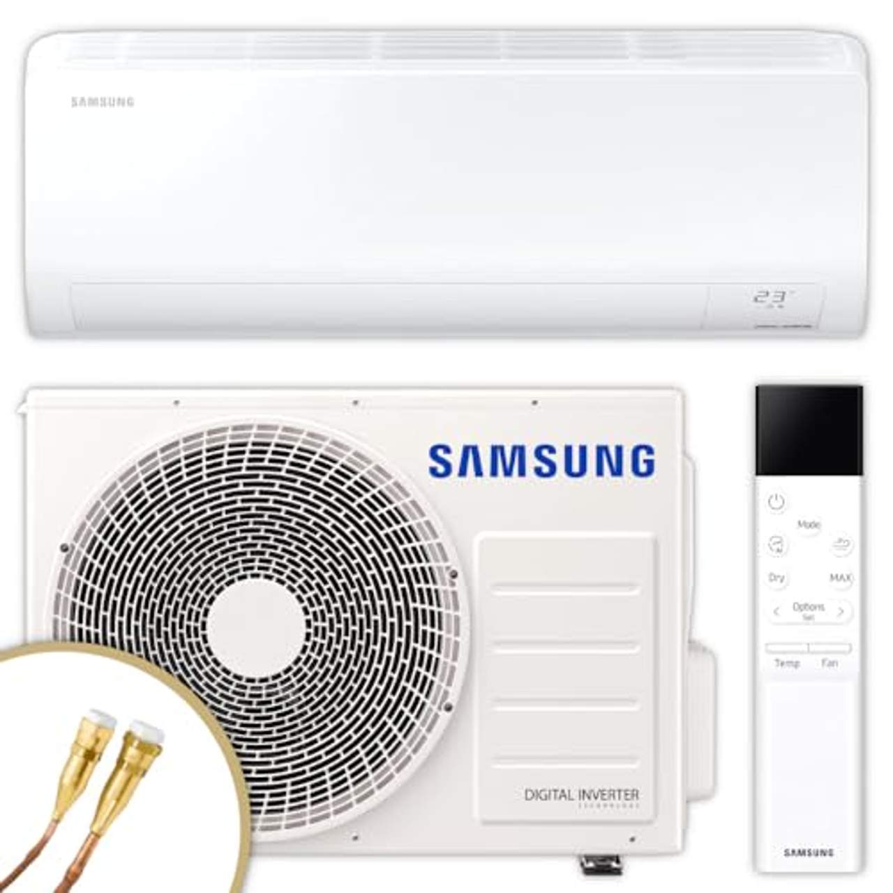 ThermoFlux Samsung Split Klimaanlage Quick-ConnectKlimaanlagen-Set Samsung Cebu – leistungsstark und intelligent Wandgerät AR50F18C1AHNEU und Außengerät AR50F18C1AHXEU mit 5,0 kW für einen Raum bis ca. 55 m². Schneller Anschluss dank Quick-Connect. Komfort beginnt mit dem richtigen Klima. Das Samsung Cebu Klimasystem bringt moderne Technik, leisen Betrieb und smarte Steuerung in Einklang. Als abgestimmte Kombination aus Innen- und Außengerät sorgt es flexibel und effizient für Wohlfühltemperaturen – egal, ob es sich um einen Hochsommertag, einen kühlen Tag oder schwüle Luft handelt. Die Bedienung ist dabei so einfach wie individuell: per App, Sprachbefehl oder klassischer Fernbedienung. Details des Cebu Wandgeräts Kühlen, Heizen, Entfeuchten, Ventilieren WiFi-Steuerung mit Sprachbefehl energieeffizienter ECO Inverter sehr leiser Betrieb mit Silent Mode Good Sleep Funktion für besseren Schlaf Luftreinigung mit Full HD-Filter automatischer Moduswechsel Heizen/Kühlen Timer und Fernbedienung inklusive unsichtbarer Luftansaug für klares Design Details des Cebu Außengeräts energieeffiziente Invertertechnologie sehr leiser Betrieb wetterfestes Gehäuse mit Korrosionsschutz kompatibel mit WiFi-Innengeräten einfache Installation durch kompakte Bauform Das Samsung Cebu Wandgerät verfügt über vier Betriebsarten:Es kühlt an heißen Sommertagen, spendet angenehme Wärme im Winter, entfeuchtet die Luft bei schwülem Wetter und sorgt im Ventilationsmodus für frische Luftzirkulation. Der ECO Digital Inverter arbeitet besonders effizient und leise, wodurch sich das Gerät auch ideal für Schlafzimmer oder Arbeitsräume eignet.Für zusätzlichen Komfort sorgen der Good Sleep Mode, der die Temperaturkurve nachts automatisch anpasst, und der Silent Mode für besonders geräuscharme Betriebsphasen. Die clevere Ausstattung umfasst zudem eine automatische Umschaltung zwischen Kühl- und Heizbetrieb, einen unsichtbaren Luftansaug und eine Luftverteilung nach oben und unten (Auto-Air-Swing).Die mitgelieferte Infrarotfernbedienung erlaubt eine einfache Steuerung, während ein 24-Stunden-Timer für zusätzlichen Komfort sorgt. Optional lässt sich das Gerät auch mit Touch-Kabelfernbedienungen erweitern, inklusive Echtzeit- und Wochenprogrammierung. Der antikorrosiv beschichtete Wärmetauscher sorgt für langlebige Leistung. Der integrierte Full-HD-Filter reinigt die Luft von Staubpartikeln und Allergenen und lässt sich unkompliziert reinigen.Nach einem Stromausfall startet die Klimaanlage automatisch neu (Auto-Restart), um ohne Eingriff wieder für Wohlfühltemperaturen zu sorgen. Das Samsung Cebu Außengerät überzeugt durch einen leisen Betrieb und eine hohe Leistungsfähigkeit, selbst bei extremen Außentemperaturen. Dank moderner Invertertechnologie passt sich die Leistung dynamisch an den tatsächlichen Bedarf an.So wird nicht nur Energie eingespart, sondern auch der Geräuschpegel minimiert. Die Samsung Cebu Außeneinheit ist auf langfristige Nutzung ausgelegt. Sie arbeitet besonders zuverlässig und verfügt über einen Korrosionsschutz, der sie wetterfest macht. Der wartungsarme Betrieb und die kompakte Bauweise erleichtern die Installation sowie die Integration in bestehende Systeme.Das Modell ist ideal für den Einsatz in kleineren Wohnhäusern, Büros oder Apartments. Die intelligente Steuerung in Kombination mit einem ansprechenden Design ermöglicht eine präzise Anpassung des Klimakomforts, ganz nach persönlichen Bedürfnissen. Ein besonderes Plus ist die Kompatibilität mit den WiFi-fähigen Cebu Innengeräten, die die Steuerung per App ermöglichen.Das sorgt für zusätzliche Flexibilität im Alltag und erlaubt den Zugriff auf alle wichtigen Funktionen von überall aus. Das Set ist auch ohne Quick-Connect-System erhältlich. Technologie des Cebu Klimaanlagensets auf den Punkt gebracht ECO Digital Inverter Der energiesparende Inverter passt die Leistung effizient an den tatsächlichen Bedarf an.Das spart Strom und sorgt für gleichmäßige Temperaturen ohne häufiges Ein- und Ausschalten. App Steuerung über Samsung SmartThings Mit der Samsung SmartThings App lassen sich Haushaltsgeräte, Energiesysteme und digitale Dienste zentral per Smartphone steuern – bequem, effizient und einfach. Die App optimiert den Energieverbrauch automatisch, zeigt aktuelle Stromkosten an und kann sogar mit PV-Anlagen, Wallboxen oder Batteriespeichern erweitert werden. So wird das Zuhause intelligent vernetzt und zukunftssicher, ganz ohne technisches Vorwissen.Geofencing Die Klimaanlage erkennt per GPS, ob sich Ihr Smartphone in der Nähe befindet. So kann sie sich automatisch einschalten, wenn Sie nach Hause kommen – oder ausschalten, wenn Sie das Zuhause verlassen. Selbstdiagnosesystem Erkennt Störungen automatisch und zeigt sie zur schnellen Fehlerbehebung an. Antikorrosiv beschichteter Wärmetauscher Der Wärmetauscher ist zum Schutz vor Rost und Verschleiß beschichtet. Neustart nach Stromausfall Nach einem Stromausfall startet das Klimagerät automatisch mit den vorherigen Einstellungen.Full HD-Filter 60 „HD“, weil seine hohe Filterleistung mit der Klarheit eines Full-HD-Bildes verglichen wird. Auto-Air-Swing up & down, manuell Die Luft wird automatisch verteilt, um den Raum gleichmäßig zu kühlen. Unsichtbarer Luftansaug Die Luftzufuhr ist elegant im Gerät verborgen und sorgt für ein aufgeräumtes Erscheinungsbild. Automatischer Moduswechsel Wechselt selbstständig zwischen Kühl- und Heizfunktion – je nach Raumtemperatur. Good Sleep Funktion Regelt die Temperatur nachts automatisch für besseren Schlafkomfort. Im Standard-Lieferumfang enthalten: Samsung Außengerät Cebu AR50F18C1AHXEU mit 5,0 kW Samsung Wandgerät Cebu AR50F18C1AHNEU mit 5,0 kW Infrarotfernbedienung 5 m 1/4’’ QUICK-CONNECT Flüssigleitung 5 m 3/8’’ QUICK-CONNECT Gasleitung 2x Kupplungshälften Klimaanlage Anschluss IG 1/4’SAE 2x Kupplungshälften Klimaanlage Anschluss IG 3/8’SAE Service: