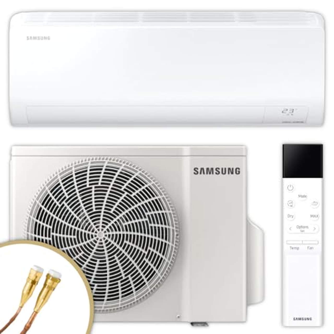 ThermoFlux Samsung Split Klimaanlage Quick ConnectKlimaanlagen-Set Samsung Cebu – leistungsstark und intelligent Wandgerät AR50F12C1AHNEU und Außengerät AR50F12C1AHXEU mit 3,5 kW für einen Raum bis ca. 40 m². Schneller Anschluss dank Quick-Connect. Komfort beginnt mit dem richtigen Klima. Das Samsung Cebu Klimasystem bringt moderne Technik, leisen Betrieb und smarte Steuerung in Einklang. Als abgestimmte Kombination aus Innen- und Außengerät sorgt es flexibel und effizient für Wohlfühltemperaturen – egal, ob es sich um einen Hochsommertag, einen kühlen Tag oder schwüle Luft handelt. Die Bedienung ist dabei so einfach wie individuell: per App, Sprachbefehl oder klassischer Fernbedienung. Details des Cebu Wandgeräts Kühlen, Heizen, Entfeuchten, Ventilieren WiFi-Steuerung mit Sprachbefehl energieeffizienter ECO Inverter sehr leiser Betrieb mit Silent Mode Good Sleep Funktion für besseren Schlaf Luftreinigung mit Full HD-Filter automatischer Moduswechsel Heizen/Kühlen Timer und Fernbedienung inklusive unsichtbarer Luftansaug für klares Design Details des Cebu Außengeräts energieeffiziente Invertertechnologie sehr leiser Betrieb wetterfestes Gehäuse mit Korrosionsschutz kompatibel mit WiFi-Innengeräten einfache Installation durch kompakte Bauform Das Samsung Cebu Wandgerät verfügt über vier Betriebsarten:Es kühlt an heißen Sommertagen, spendet angenehme Wärme im Winter, entfeuchtet die Luft bei schwülem Wetter und sorgt im Ventilationsmodus für frische Luftzirkulation. Der ECO Digital Inverter arbeitet besonders effizient und leise, wodurch sich das Gerät auch ideal für Schlafzimmer oder Arbeitsräume eignet.Für zusätzlichen Komfort sorgen der Good Sleep Mode, der die Temperaturkurve nachts automatisch anpasst, und der Silent Mode für besonders geräuscharme Betriebsphasen. Die clevere Ausstattung umfasst zudem eine automatische Umschaltung zwischen Kühl- und Heizbetrieb, einen unsichtbaren Luftansaug und eine Luftverteilung nach oben und unten (Auto-Air-Swing).Die mitgelieferte Infrarotfernbedienung erlaubt eine einfache Steuerung, während ein 24-Stunden-Timer für zusätzlichen Komfort sorgt. Optional lässt sich das Gerät auch mit Touch-Kabelfernbedienungen erweitern, inklusive Echtzeit- und Wochenprogrammierung. Der antikorrosiv beschichtete Wärmetauscher sorgt für langlebige Leistung. Der integrierte Full-HD-Filter reinigt die Luft von Staubpartikeln und Allergenen und lässt sich unkompliziert reinigen.Nach einem Stromausfall startet die Klimaanlage automatisch neu (Auto-Restart), um ohne Eingriff wieder für Wohlfühltemperaturen zu sorgen. Das Samsung Cebu Außengerät überzeugt durch einen leisen Betrieb und eine hohe Leistungsfähigkeit, selbst bei extremen Außentemperaturen. Dank moderner Invertertechnologie passt sich die Leistung dynamisch an den tatsächlichen Bedarf an.So wird nicht nur Energie eingespart, sondern auch der Geräuschpegel minimiert. Die Samsung Cebu Außeneinheit ist auf langfristige Nutzung ausgelegt. Sie arbeitet besonders zuverlässig und verfügt über einen Korrosionsschutz, der sie wetterfest macht. Der wartungsarme Betrieb und die kompakte Bauweise erleichtern die Installation sowie die Integration in bestehende Systeme.Das Modell ist ideal für den Einsatz in kleineren Wohnhäusern, Büros oder Apartments. Die intelligente Steuerung in Kombination mit einem ansprechenden Design ermöglicht eine präzise Anpassung des Klimakomforts, ganz nach persönlichen Bedürfnissen. Ein besonderes Plus ist die Kompatibilität mit den WiFi-fähigen Cebu Innengeräten, die die Steuerung per App ermöglichen.Das sorgt für zusätzliche Flexibilität im Alltag und erlaubt den Zugriff auf alle wichtigen Funktionen von überall aus. Das Set ist zum schnellen Anschluss auch mit Quick-Connect-System erhältlich. Technologie des Cebu Klimaanlagensets auf den Punkt gebracht ECO Digital Inverter Der energiesparende Inverter passt die Leistung effizient an den tatsächlichen Bedarf an.Das spart Strom und sorgt für gleichmäßige Temperaturen ohne häufiges Ein- und Ausschalten. App Steuerung über Samsung SmartThings Mit der Samsung SmartThings App lassen sich Haushaltsgeräte, Energiesysteme und digitale Dienste zentral per Smartphone steuern – bequem, effizient und einfach. Die App optimiert den Energieverbrauch automatisch, zeigt aktuelle Stromkosten an und kann sogar mit PV-Anlagen, Wallboxen oder Batteriespeichern erweitert werden. So wird das Zuhause intelligent vernetzt und zukunftssicher, ganz ohne technisches Vorwissen.Geofencing Die Klimaanlage erkennt per GPS, ob sich Ihr Smartphone in der Nähe befindet. So kann sie sich automatisch einschalten, wenn Sie nach Hause kommen – oder ausschalten, wenn Sie das Zuhause verlassen. Selbstdiagnosesystem Erkennt Störungen automatisch und zeigt sie zur schnellen Fehlerbehebung an. Antikorrosiv beschichteter Wärmetauscher Der Wärmetauscher ist zum Schutz vor Rost und Verschleiß beschichtet. Neustart nach Stromausfall Nach einem Stromausfall startet das Klimagerät automatisch mit den vorherigen Einstellungen.Full HD-Filter 60 „HD“, weil seine hohe Filterleistung mit der Klarheit eines Full-HD-Bildes verglichen wird. Auto-Air-Swing up & down, manuell Die Luft wird automatisch verteilt, um den Raum gleichmäßig zu kühlen. Unsichtbarer Luftansaug Die Luftzufuhr ist elegant im Gerät verborgen und sorgt für ein aufgeräumtes Erscheinungsbild. Automatischer Moduswechsel Wechselt selbstständig zwischen Kühl- und Heizfunktion – je nach Raumtemperatur. Good Sleep Funktion Regelt die Temperatur nachts automatisch für besseren Schlafkomfort. Im Standard-Lieferumfang enthalten: Samsung Außengerät Cebu AR50F12C1AHXEU mit 3,5 kW Samsung Wandgerät Cebu AR50F12C1AHNEU mit 3,5 kW Infrarotfernbedienung 5 m 1/4’’ QUICK-CONNECT Flüssigleitung 5 m 3/8’’ QUICK-CONNECT Gasleitung 2x Kupplungshälften Klimaanlage Anschluss IG 1/4’SAE 2x Kupplungshälften Klimaanlage Anschlus