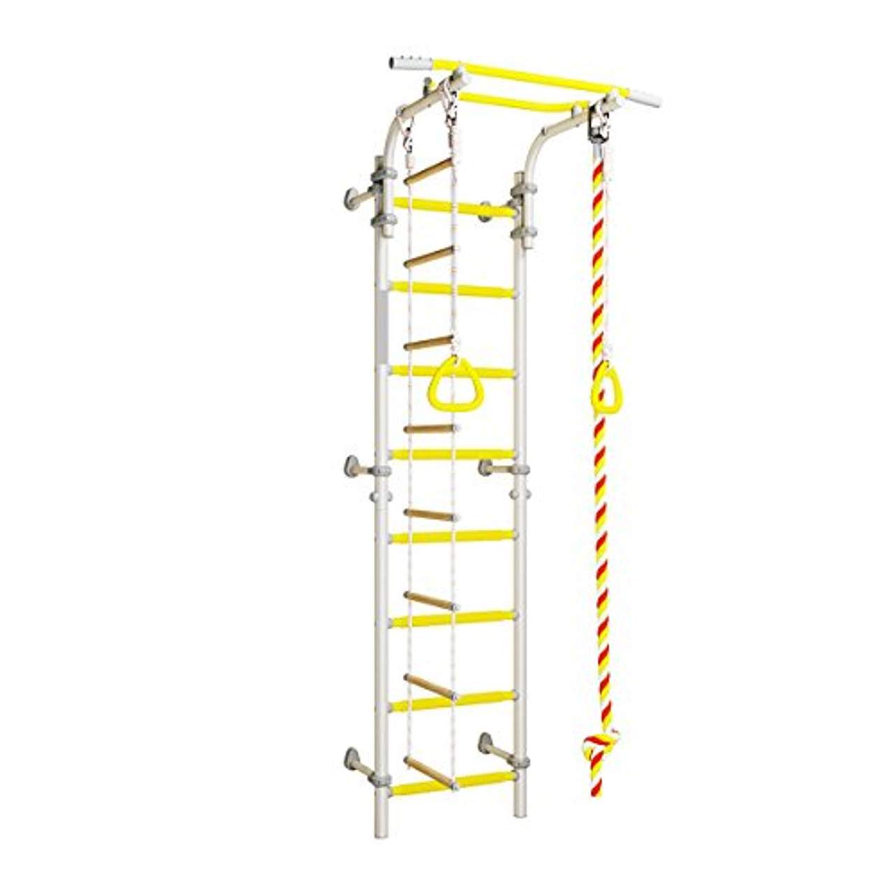 Christopeit Sport Kinder Wallbarz Sprossenwand Family 2WWallbarz Indoor Sprossenwand Funny Monkey 9D mit Deckenmontage in Weiß-Gelb, EG-KSK-009WMultifunktionales Indoor Spiel- und Klettergerüst mit Sprossenwand, Trapezschaukel ,einem Reck, Klettertau, Turnringen und eine zusätzliche Kletterwand für Kinder. Aus hochwertigem Metall gefertigt, bringt es Spielspaß und Freude in Ihr Zuhause und bietet Ihren Kindern die Möglichkeit, sich mehr zu bewegen und ihre Geschicklichkeit, Körperbeherrschung und Motorik zu trainieren. Durch den Zusatz der Kletterwand, hat Ihr Kind ein noch größeren Spaßfaktor an der Sprossenwand, da sich damit viele weitere Möglichkeiten bieten um Spiel, Spaß und Sport miteinander zu verknüpfen.