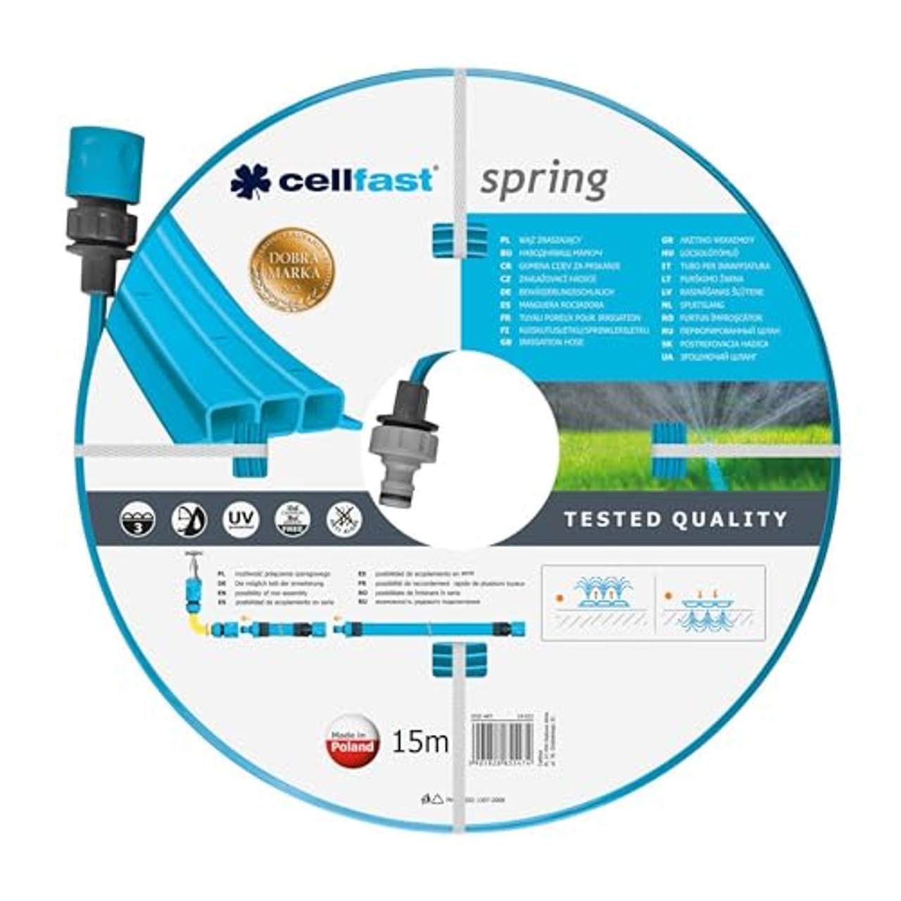 Cellfast Bewässerungsschlauch Spring DreikanalbewässerungsschlauchDreikanalbewässerungsschlauch komplett mit Verbindungsstücken Gleichmäßige Bewässerung auf der ganzen Schlauchlänge Spart Wasser und Zeit UV-Strahlenbeständig Cadmium- und Bariumfrei Wasserverbrauch 1bar – 5,5 l/h pro 1 Meter Schlauch Erweiterbar bis max. 22,5 m ##Westfalia##Garten##Bewässerung##Bewässerungssysteme Anschluss und Verbindungsmaterial##Gartenschlauch