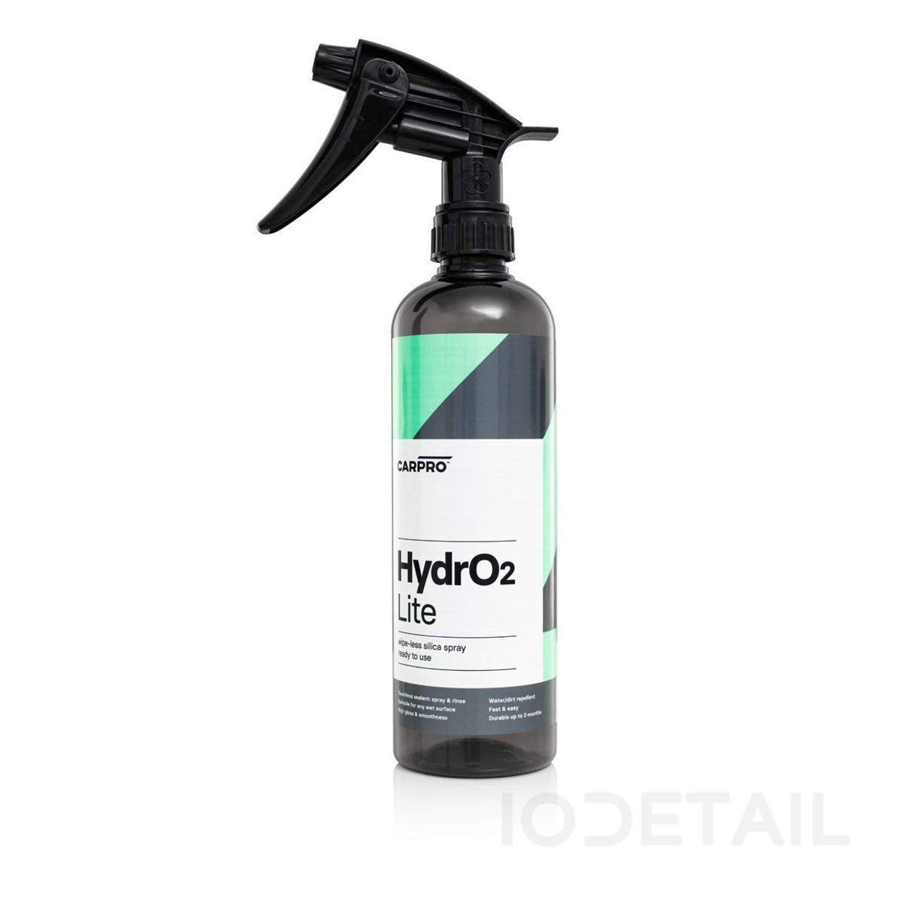CarPro HydrO2 Lite Sprühversiegelung Versiegelung Ready-to-Use 1Ldie Carpro HydrO2 Sprühversiegelung erzeugt einen streifenfreien Glanz ohne jegliches Wischen oder Auspolieren. Das Gemisch aus hydrophilen Glasfasern und Polymeren ist in der Ready-to Use Version fertig gemischt und kann einfach direkt auf die nasse, frisch gewaschene Oberfläche des Fahrzeugs gesprüht, das ganze funktioniert auf dem kompletten Lack, Scheiben, Stoff-/Vinylverdeck, Reifen und Felgen. Anschließend mit starkem Wasserstrahl z.B. Hochdruckreiniger das Produkt auf der Oberfläche „härten“.Ideal um nach der Wäsche das Auto zu versiegeln, kein nachpolieren und kein Abtrocknen nötig.Und so geht das technisch:das ‚hydrolelctric bonding‘ genannte Adhäsionsverfahren bezeichnet die chemische Reaktionszeit unter Wasserkontakt. Die erzeugte HydrO2-Beschichtung wird bei dieser Reaktion von hydrophil zu hydrophob transportiert. Durch den Druck vom Hochdruckreiniger wird die Bindung zur Lackoberfläche beschleunigt.Anwendungshinweise:Fahrzeug wie gewohnt waschen, Dann in Teilbereichen Hydro2 aufsprühen und mit starkem Wasserstrahl die Oberflächen nachspülen. Vorgang für alle Bereiche wiederholen, fertig. Produkt kann auch auf die saubere Oberfläche gesprüht werden und mit einem Microfasertuch nachgewischt werden. Nur in gut belüfteten Bereichen auf die kühle Oberfläche im Schatten anwenden.Lieferumfang: 1 Flasche 1 Liter inkl. Sprühkopf Ready-to-Use
