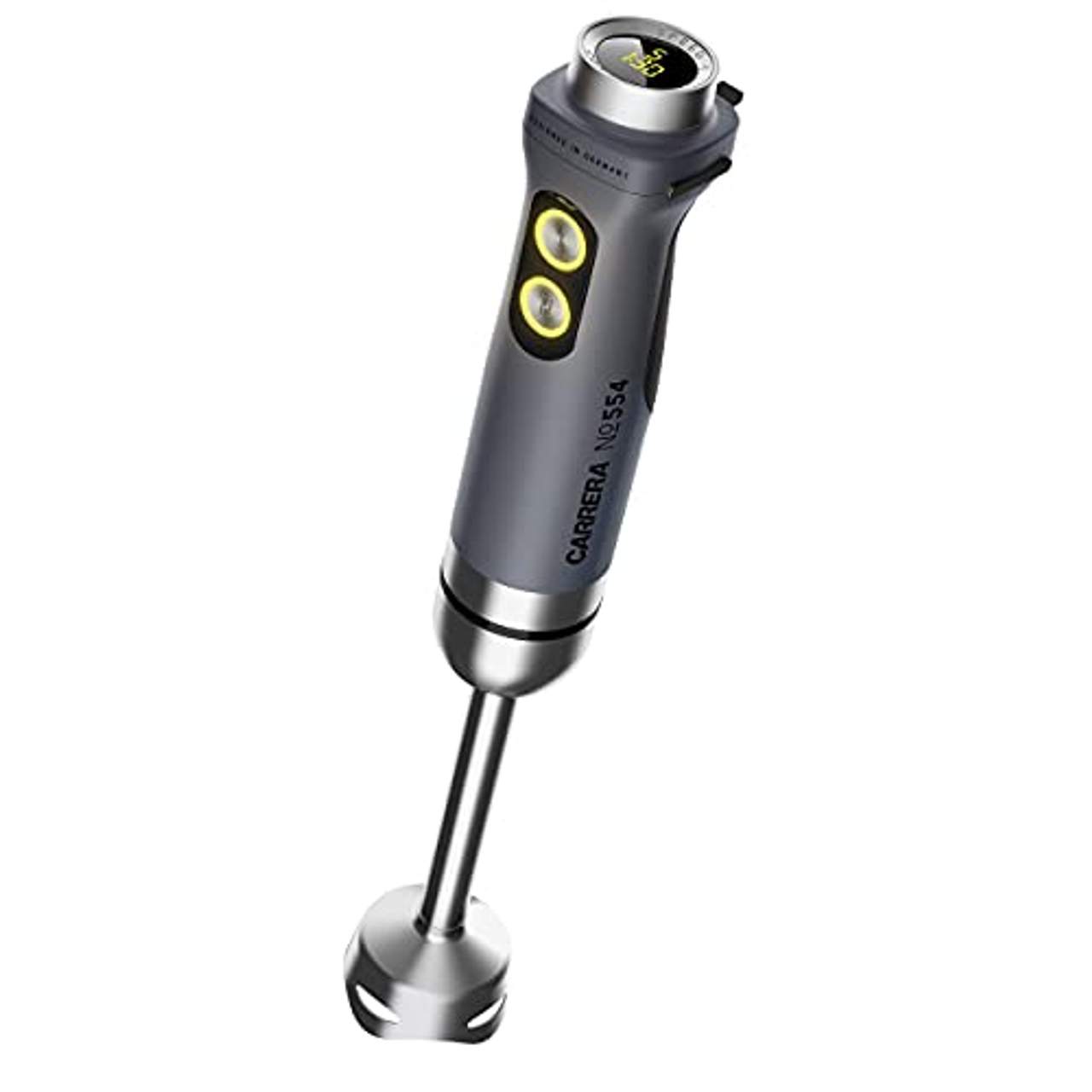 CARRERA Stabmixer No 554 Edelstahl SchneidmesserBLEIBT SAUBER. Mixen, Häckseln, Pürieren - manchmal muss es in der Küche einfach schnell gehen. Unkontrolliertes Spritzen braucht dabei kein Mensch. Deshalb haben wir die 800 Watt unseres Profi-Stabmixers mit einem Soft Start gezähmt. So werden die PS wie bei einem modernen Formel-1-Rennwagen mit Launch-Control mit Bedacht losgelassen.Weil Sie ja viel lieber Mixen wollen, als Küche putzen. Zudem hat unser Stabmixer ein schickes LED-Display, das nicht nur den eingelegten Gang, sondern auch die genaue Mixzeit anzeigt. MIT 5 GESCHWINDIGKEITSSTUFEN UND TURBO-GANG IN DER KÜCHE. Vom Motor bis zu den Klingen: Überall, wo seine 800 Watt arbeiten ist bei unserm Stabmixer alles aus Edelstahl. So geht es schnurstracks durch Nüsse, Zähes und Heißes. Mit Edelstahl-Schneidmessern Eiswürfel zermalmen macht Spaß.Crushed Ice hat aber auch ganz handfeste Vorteile. Es kühlt zum Beispiel viel wirkungsvoller als ganze Eiswürfel. Wer unseren Stabmixer kauft, kann sich schon jetzt auf seine nächste Cocktailparty freuen. Auch Caipi und Piña Colada wissen die vergrößerte Oberfläche der kleinen Eisstückchen zu schätzen, denn so werden sehr starke oder dickflüssige Cocktails perfekt verdünnt. Wer mit Eiswürfeln anfängt, püriert bald auch tiefgefrorene Beeren. Mit einem Mixfuß aus Edelstahl ein Spaziergang.Aber Finger weg von Gletschern und Polkappen! 2 Jahre Garantie, verlängerbar auf 36 Monate