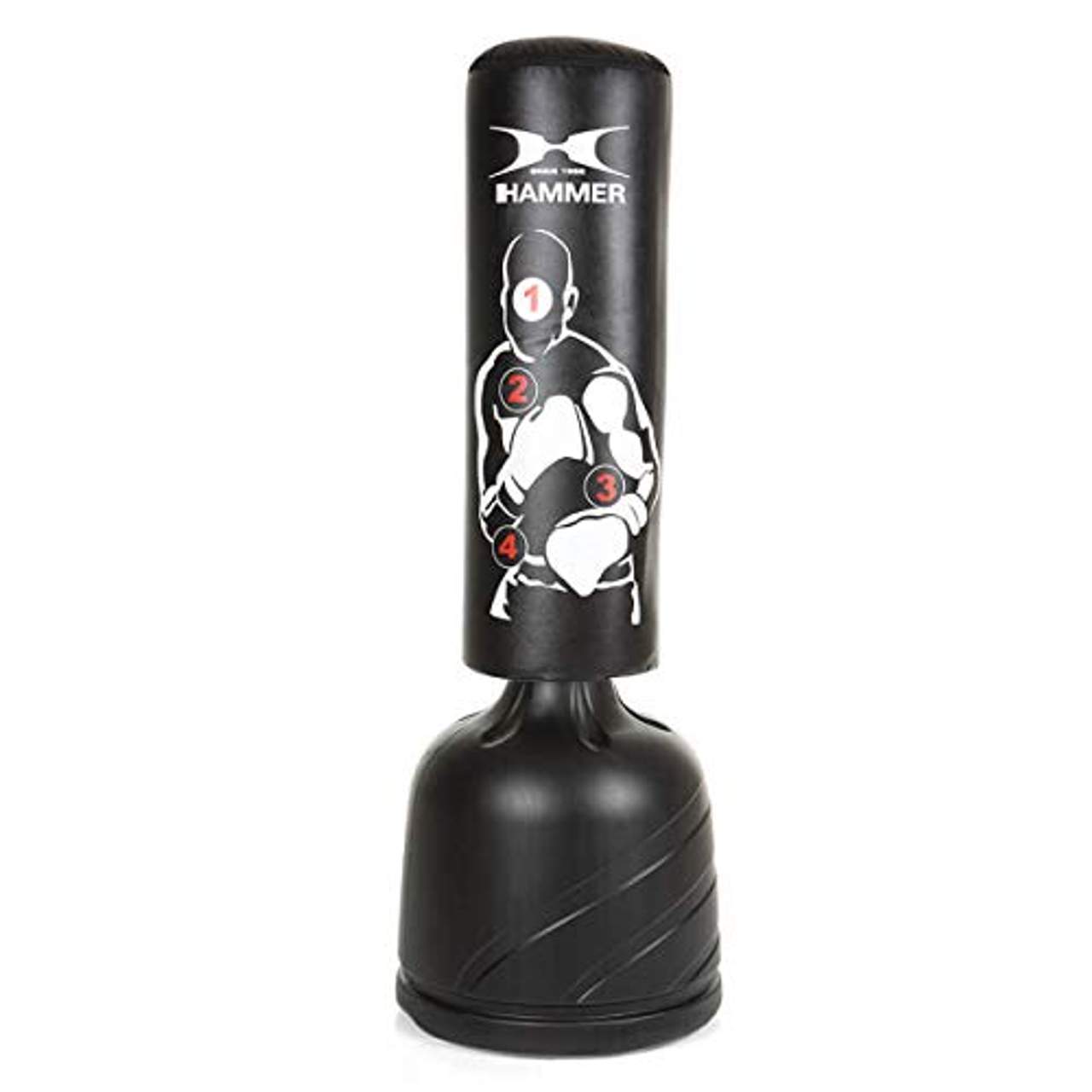 Hammer Boxing Standboxsack Sparring ProDer Standboxsack von Hammer ermöglicht das Training an jedem beliebigen Ort. Im Garten, in der Wohnung, im Büro oder im Keller, mit dem Standboxsack Sparring Pro in schwarzem Design kann überall trainiert werden. Der große Standfuß kann mit Wasser, Sand oder Kies befüllt werden und hält selbst härtere Schläge aus ohne umzufallen.An die Körpergröße kann der Standboxsack durch 3-fache Höhenverstellbarkeit individuell angepasst werden. Das Modell Sparring Pro ist gut verarbeitet und besteht aus pflegeleichtem PU-Material. Dank aufgedruckter Trefferflächen, können Schlagkombinationen realitätsnah trainiert werden, wodurch eine optimale Wettkampfvorbereitung kein Problem ist.