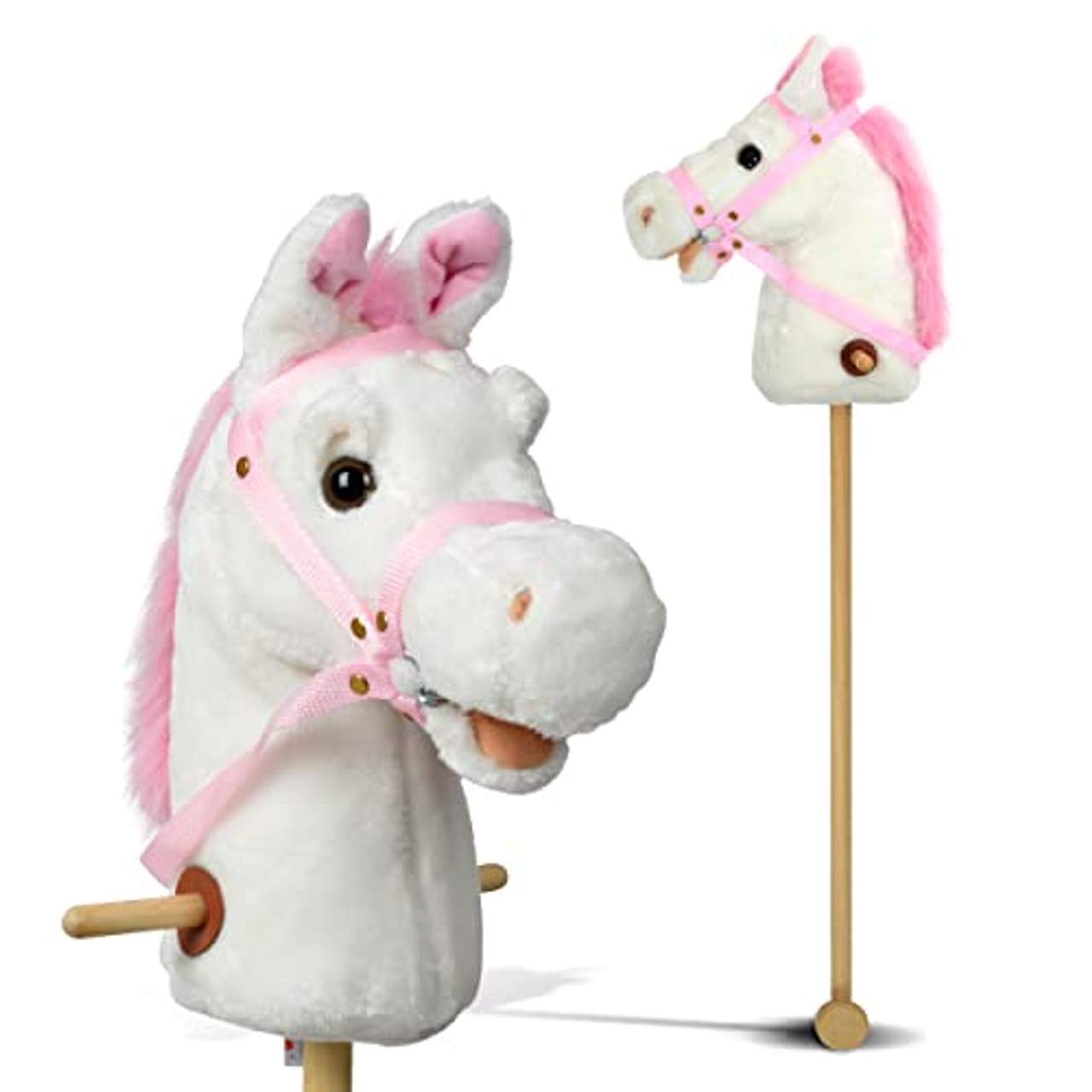 - Schönes Design: Das Produkt hat ein schönes Design mit hochwertiger Verarbeitung, was es zu einem idealen Geschenk für Kinder macht. Es hat einen weichen Plüschkopf mit Griffen und Zügeln an einem 65 cm langen Holzstab mit praktischen Holzrädern.