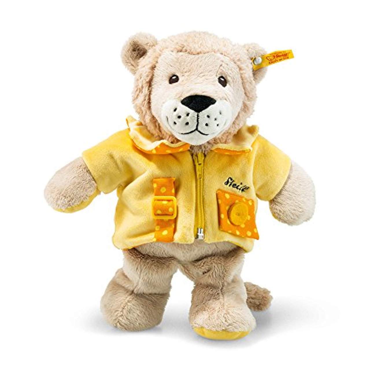Steiff 240607 Leon LoeweLeon, der große, starke Löwe, erweckt Kraft und stärkt das Selbstbewusstsein. Der sympathische Löwe ist 30 cm groß. Die gelbe Jacke mit appliziertem Steiff-Logo enthält drei Lernfunktionen: Knopf, Schlaufe und Reißverschluss. Erst nach dem Öffnen dieser Schliessmechanismen kann Leon seine Jacke ausziehen.Optimal zur Förderung der Motorik.