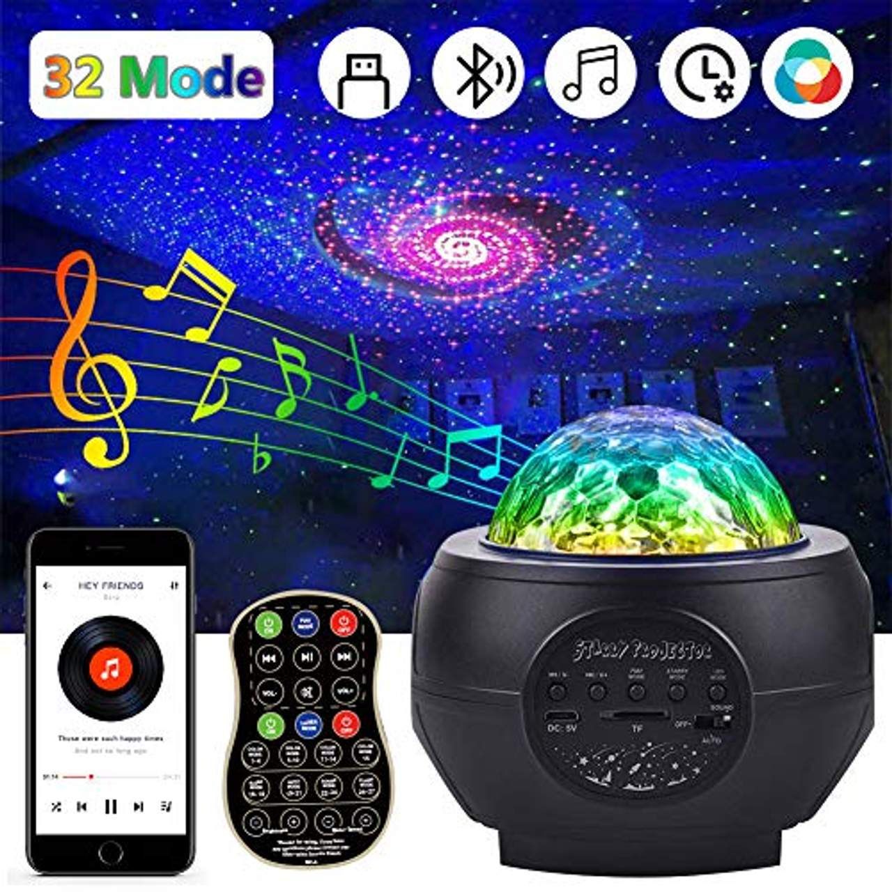 - Fernbedienung und manuelle Steuerung: Das Produkt wird mit einer Fernbedienung geliefert, mit der der Benutzer die Sterne, die Lichter, die Helligkeit, das freie Drehen der Lichter, den Wechsel der Beleuchtungsmodi und die Musikstücke einfach steuern kann. Außerdem verfügt das Produkt über eine automatische Abschaltfunktion, die hilft, Strom und Geld zu sparen.