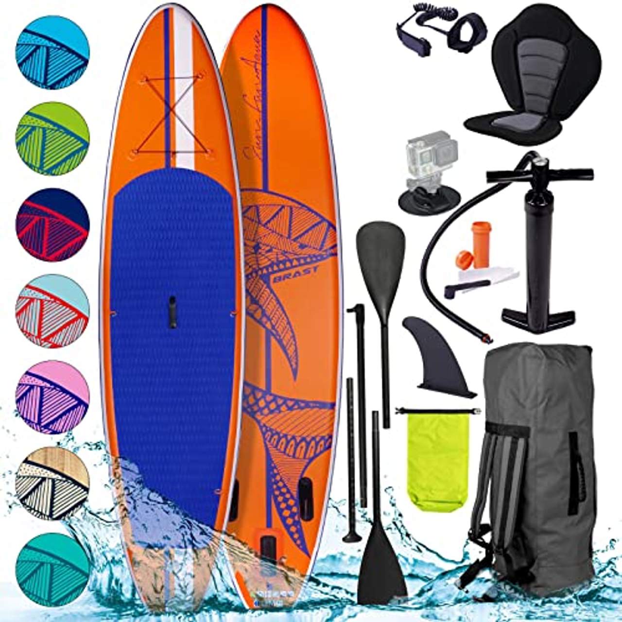 Das SUP Board Stand up Paddle Paddling Surfboard Shark Orange von BRAST sticht aus dem überfüllten Markt der Stand up Paddle Boards heraus, vor allem durch seine innovative WOVEN Drop Stitch Technologie. Diese Innovation macht das Board nicht nur leichter und deutlich steifer als seine Konkurrenten, sondern verbessert auch die Gesamtleistung auf dem Wasser. Wir bewundern vor allem die gummierte Wabenstruktur für ihre rutschfeste Oberfläche, die einen hervorragenden Fußkomfort und sicheren Halt bietet. Ein weiteres erwähnenswertes Merkmal ist das Kickpad am Heck für wendiges und effizientes Drehen, das eine schnelle Manövrierfähigkeit bei gleichbleibender Geschwindigkeit ermöglicht. Mit einer beachtlichen Tragfähigkeit von 130 kg und einem Drei-Flossen-System für optimale Richtungsstabilität weist dieses Board eine bemerkenswerte Steifigkeit und Langlebigkeit auf - sicher getestet über 40 psi. Das mitgelieferte verstellbare Teleskoppaddel und der robuste Transportrucksack bieten einen hohen Mehrwert und machen es zu einer hervorragenden Wahl für Paddler aller Könnensstufen. Angesichts der hervorragenden Verarbeitungsqualität, des durchdachten Designs und des sehr guten Gesamtergebnisses in unserem Kaufratgeber empfehlen wir dir, das SUP Board Stand up Paddle Paddling Surfboard Shark Orange in deinen persönlichen SUP Board Test aufzunehmen, um ein erstklassiges Paddleboarding-Erlebnis zu genießen.