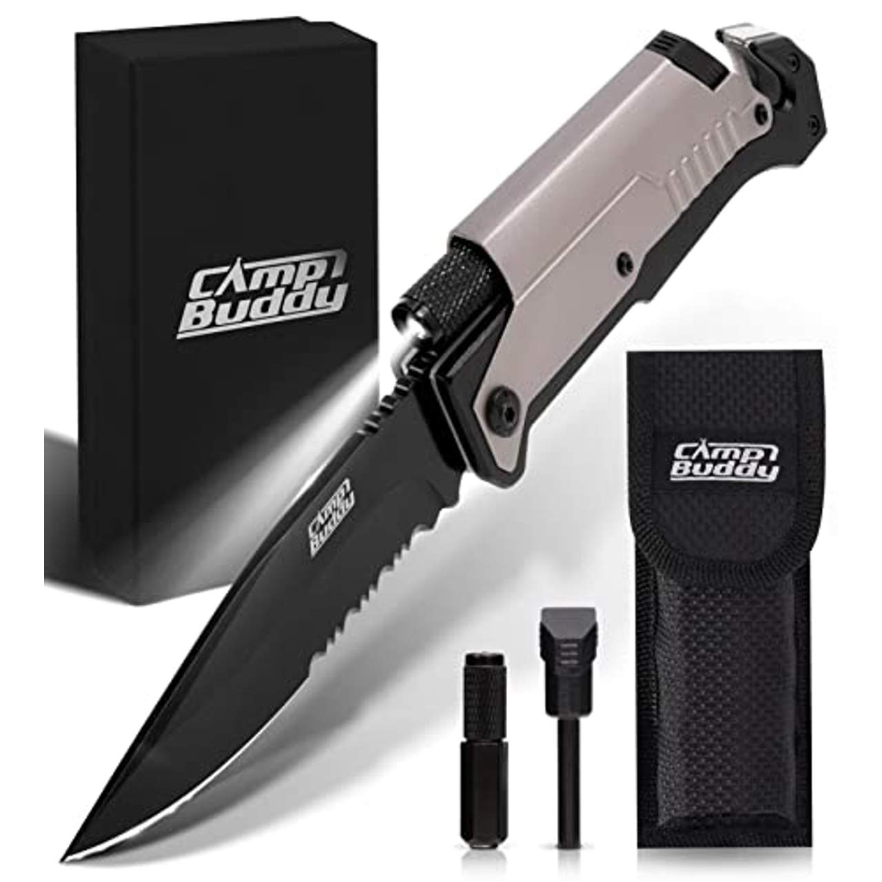 - Vielseitiges Werkzeug: Das CampBuddy 5-in-1 Survival Messer ist ein Mehrzweckwerkzeug mit einer Klinge zum Schneiden und Sägen, einem Gurtschneider zur Unfallrettung, einem Glasbrecher zum Zerbrechen von Glas, einer LED-Lampe zur Beleuchtung und einem Magnesiumfeuerstahl zum Feuermachen. Dies macht es zu einem idealen Werkzeug für Outdoor-Abenteurer, Soldaten, Feuerwehrleute, Camping und Jagd.