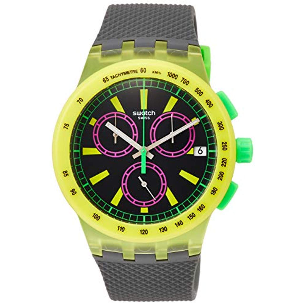 Swatch Chronograph Armbanduhr YEL-LOL SUSJ402Swiss Made, aus der Kollektion The Swatch Vibe, Kunststoff-Gehäuse, gelbe Lünette mit schwarzer Tachymeter-Skala, Kunststoffglas, wasserdicht bis 3 bar, Breite 42 mm, Höhe 14 mm, Armband aus Silikon, Dornschließe, schwarzes Zifferblatt, präzises Quarzwerk, Datumsanzeige, pink umrandetete Hilfszifferblätter mit weißen Zeigern, gelbe Indexe, Leuchtzeiger, grüner zentraler Sekundenzeiger