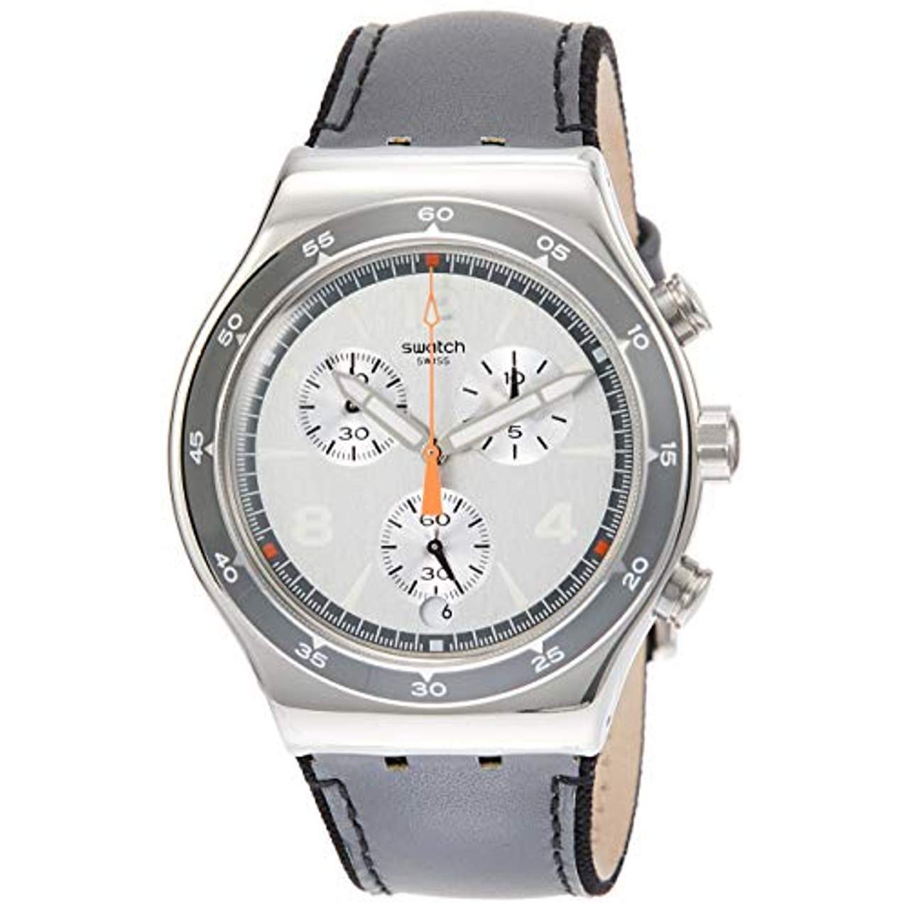- Stilvolles Aussehen: Die Swatch Irony Chrono Herrenuhr Last Round YVS446 hat ein attraktives Design mit einem silbernen Zifferblatt und einem schwarzen Lederband, das sie modisch und stilvoll aussehen lässt.