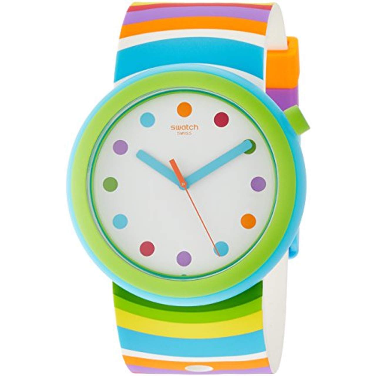 Swatch Damen Analog Quarz Uhr PNL100Pop-Swatch aus der Kollektion Chrono Plastic & Pop, Swiss Made, türkises Kunststoffgehäuse, grüne Lünette, Kunststoffglas, wasserdicht geprüft bis 3 bar, Durchmesser 45 mm, Höhe 12,5 mm, Silikon-Wendearmband, Vorderseite mit bunten Streifen, Rückseite weiß mit farbigen Akzenten, Dornschließe, 3-Zeiger-Quarzwerk, weißes Zifferblatt, hellblaue Zeiger, orangefarbener Sekundenzeiger