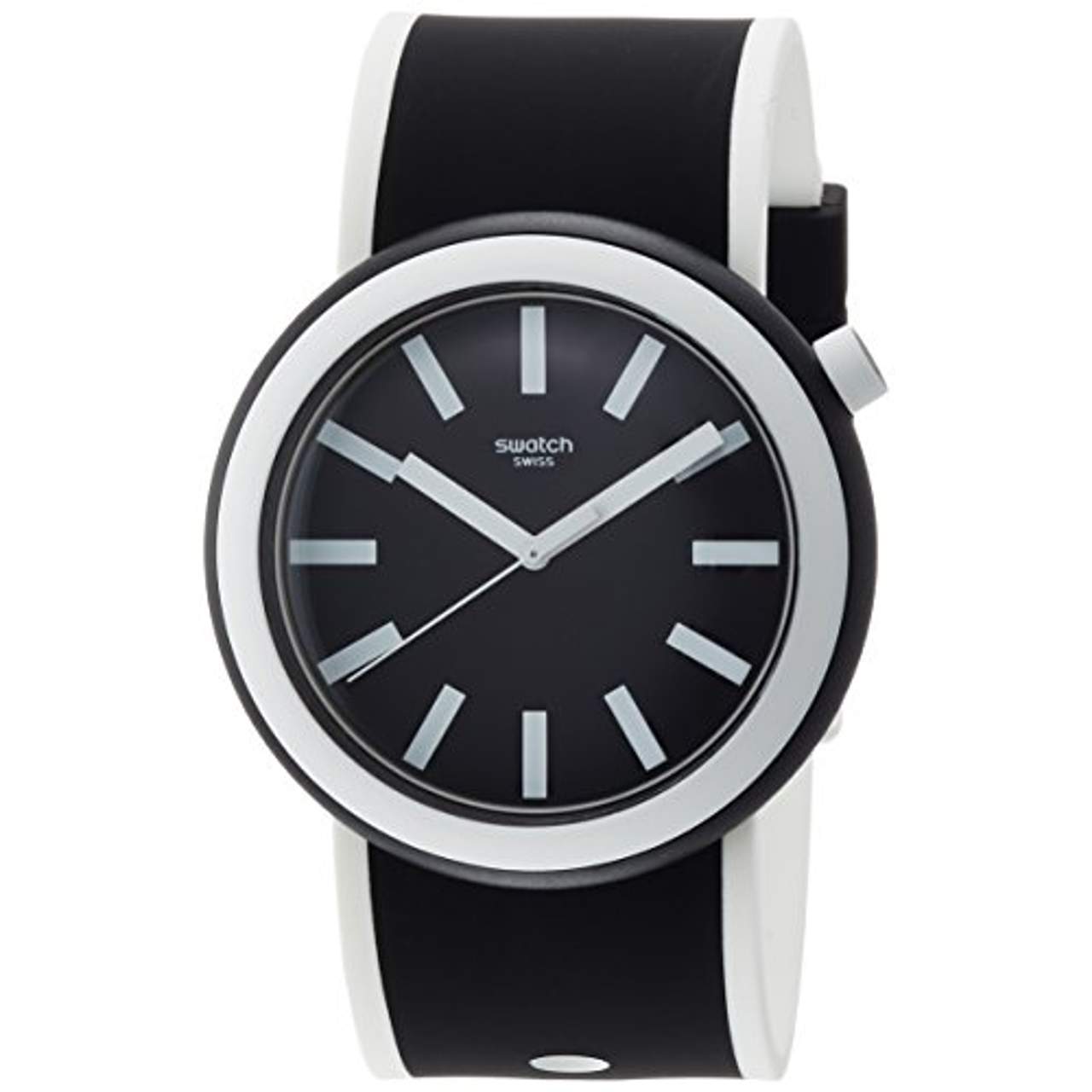 Diese Swatch Uhr für Frauen heißt „Swatch Damen Digital Quarz Uhr PNB100“. Sie hat ein schwarzes Silikonarmband und ein Kunststoffgehäuse. Das Zifferblatt ist schwarz mit weißen Indexen und Zeigern und hat einen Durchmesser von 44 mm. Sie ist batteriebetrieben und bis zu 30 m wasserdicht. Das Uhrenglas ist aus Kunststoff und kann poliert werden. Sie wird mit einem Clip geliefert, mit dem sie auch ohne Armband oder Kette getragen werden kann. Die Uhr wiegt 34 g ohne Armband und Kette.