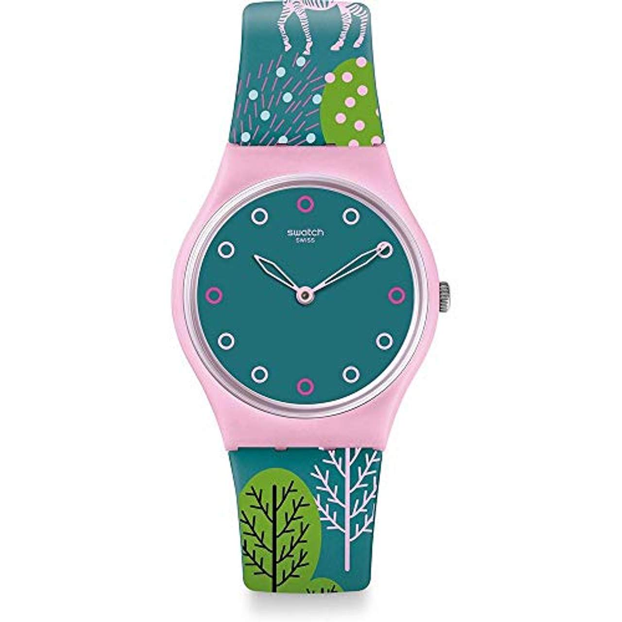 - Stilvolles Design: Die Swatch Damenuhr Hwange GP152 besticht durch ein grünes Kunststoffarmband mit Zebra- und Baumaufdruck, eine pinkfarbene Dornschließe, ein grünes Zifferblatt, pinkfarbene Zeiger und pinkfarbene Indexe.