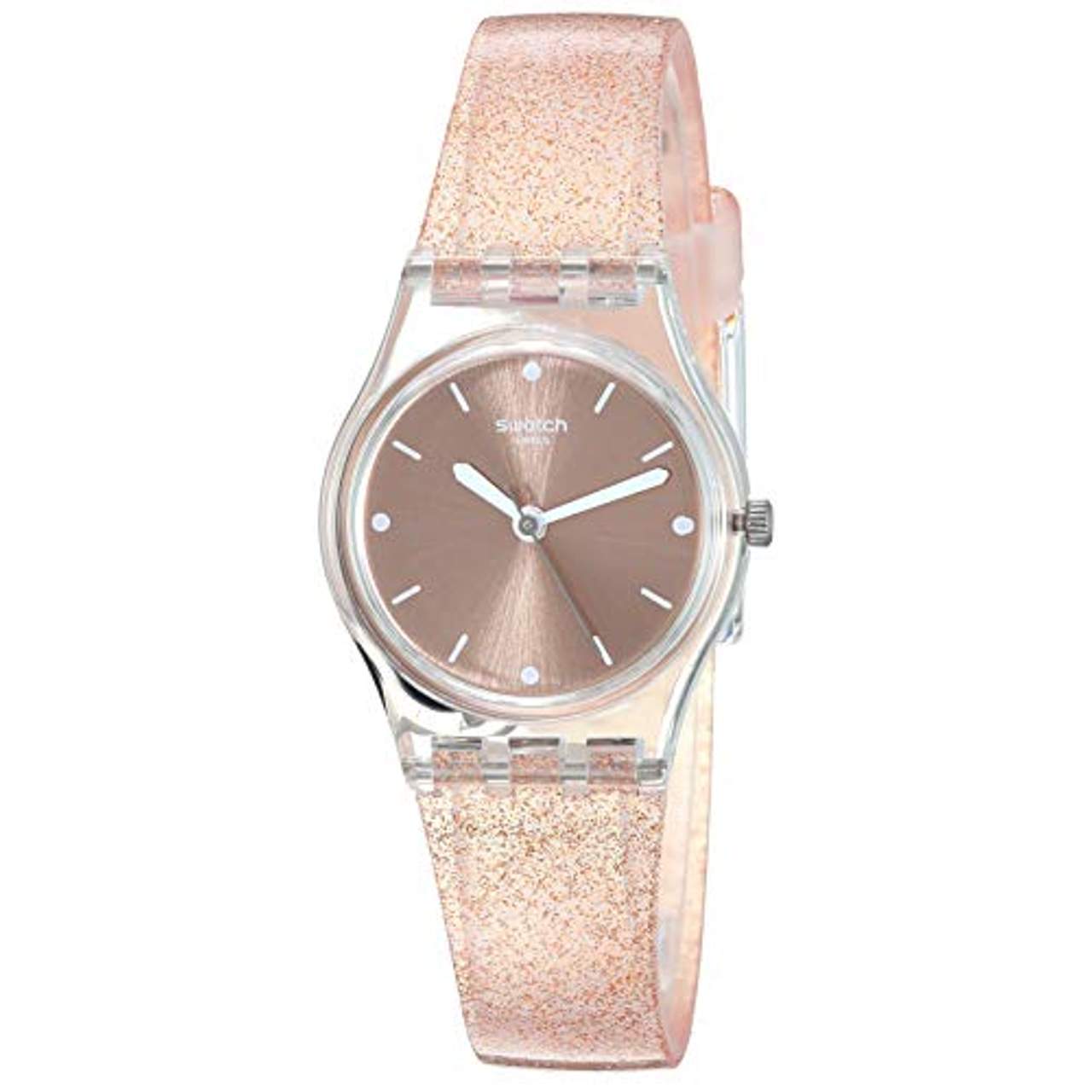 - Modisches Design: Mit einem rosafarbenen Zifferblatt mit Swatch-Schriftzug und einem halbtransparenten Silikonarmband mit roségoldfarbenem Glitzer ist diese Uhr ein echter Hingucker und ein modisches Statement.