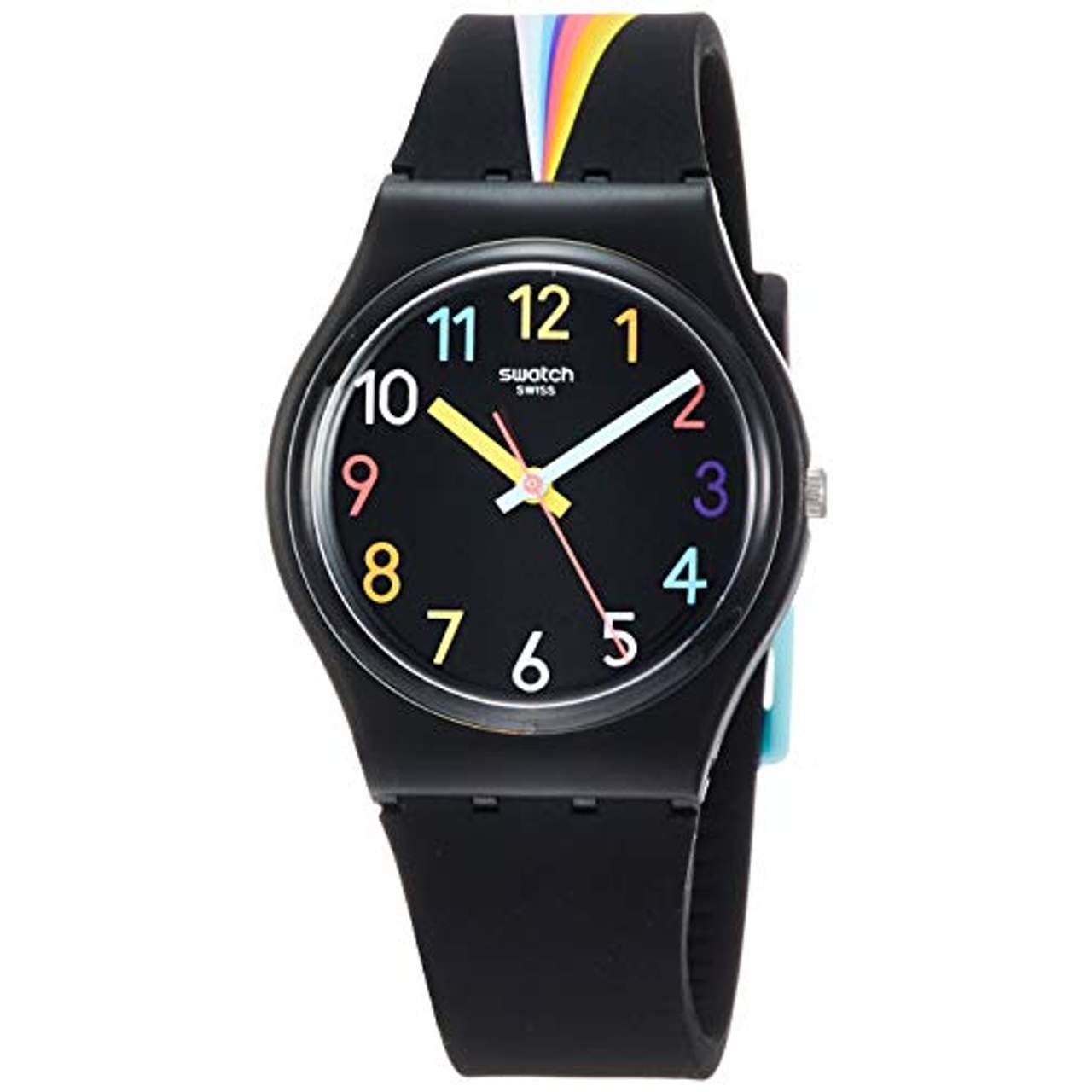 Swatch Herren Analog Quarz Uhr GB311Uhr in Unisex-Größe, Swiss Made, aus der Kollektion Think Fun, schwarzes Kunststoff-Gehäuse, gewölbtes Kunststoffglas, schwarzes Silikonarmband mit Dornschließe, bedruckt mit einem bunten Streifenmuster, 3-Zeiger-Quarzwerk, schwarzes Zifferblatt, hellblauer und gelber Zeiger, bunte Zahlen, zentraler Sekundenzeiger, wasserdicht bis 3 bar, Durchmesser 34 mm, Höhe 8,75 mm