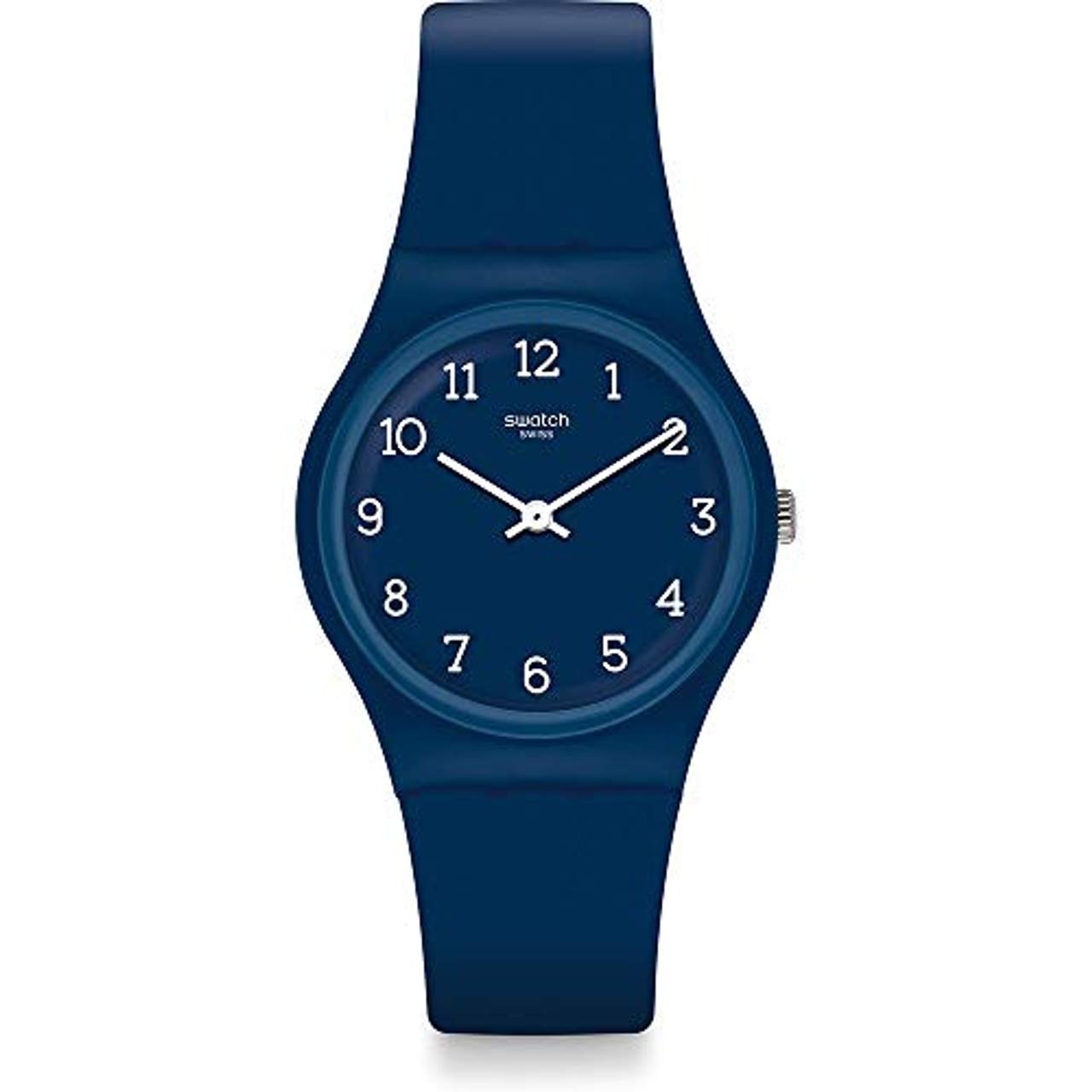 Swatch Herren Analog Quarz Uhr GN252Swiss Made, aus der Kollektion Time to Swatch, blaues Kunststoff-Gehäuse, gewölbtes Kunststoffglas, wasserdicht geprüft bis 3 bar, Durchmesser 34 mm, Höhe 9 mm, blaues Silikonarmband mit Dornschließe, 2-Zeiger-Quarzwerk, blaues Zifferblatt mit weißen Zahlen, weiße Zeiger