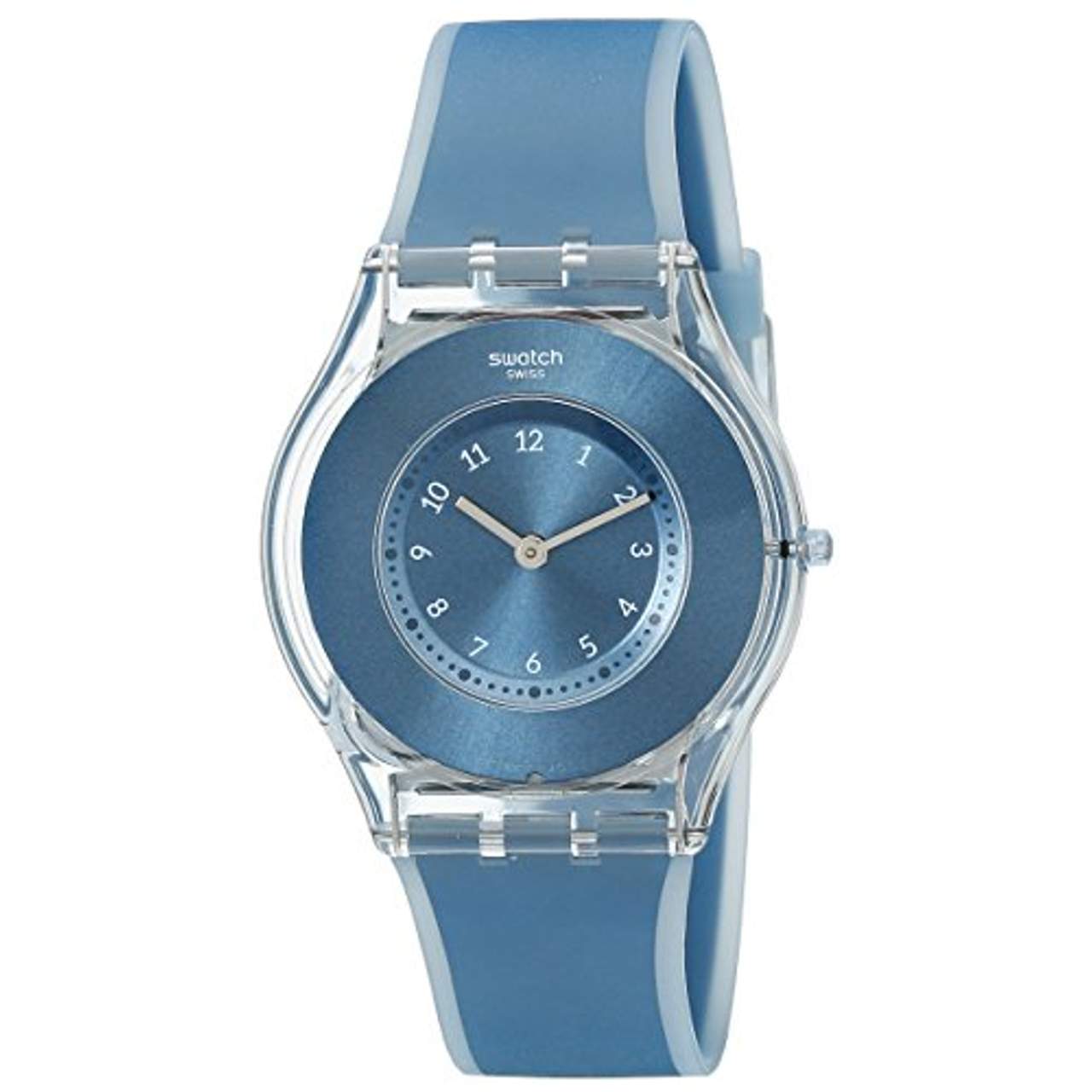 Swatch Unisex-Uhr Digital Quarz SFS103Swiss Made Armbanduhr aus der Skin Kollektion, ultraflaches transparentes Kunststoffgehäuse, polierbares Kunststoffglas, wasserdicht geprüft bis 3 bar, Durchmesser (ohne Krone) 34 mm, Höhe 4 mm, blaues Silikon-Armband, Dornschließe, 2-Zeiger-Quarzuhrwerk, blaues Sunray-Zifferblatt, silberfarbene Zahlen, polierte Zeiger