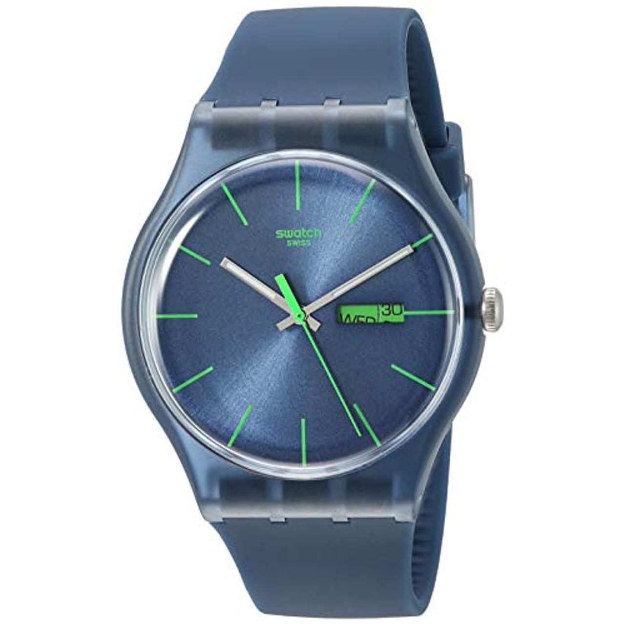 Swatch Herren-Armbanduhr Blue Rebel Analog Quarz SUON700Swiss Made Uhr, blaues Kunststoffgehäuse, wasserdicht geprüft bis 3 bar, Durchmesser (ohne Krone) 41 mm, Höhe 10 mm, blaues Silikonarmband, Dornschließe, 3-Zeiger-Quarzuhrwerk, Anzeige von Datum und Wochentag (englisch), blaues Sunray-Zifferblatt, Strichindexe, lumineszierende Zeiger, neongrüner Sekundenzeiger