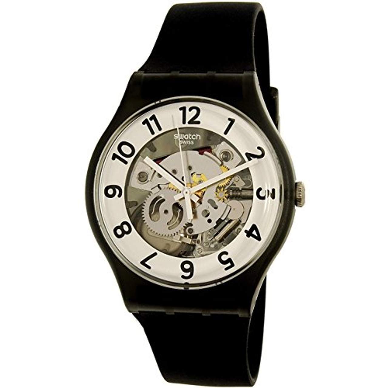 - Stilvoll: Mit ihrem eleganten schwarzen Kunststoffgehäuse, der weißen Lünette und dem transparenten Zifferblatt ist diese Swatch-Uhr ein echter Hingucker an jedem Handgelenk. Das klassische Design sorgt außerdem dafür, dass sie nie aus der Mode kommt.