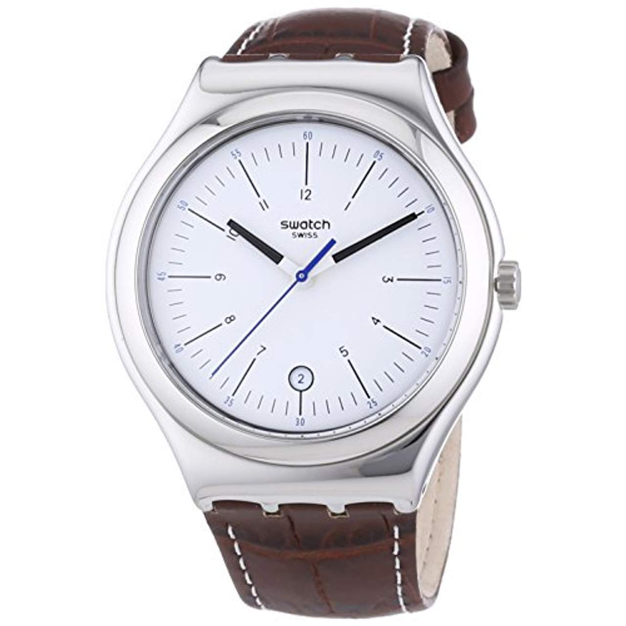 Swatch Herrenuhr Analog Quarz YWS401Swiss Made Herrenarmbanduhr aus der Irony Big Serie, Edelstahlgehäuse, Kunststoffgla, wasserdicht geprüft bis 3 bar, Durchmesser (ohne Krone) 41 mm, Höhe 11 mm, braunes Lederband mit Krokoprägung und Kontrastnaht, Edelstahl-Faltschließe mit Sicherheitsdrücker, 3-Zeiger-Uhrwerk, Datumsanzeige, weißes Zifferblatt, dezente graue Zahlen und Indexe mit blauen Akzenten, blauer Sekundenzeiger