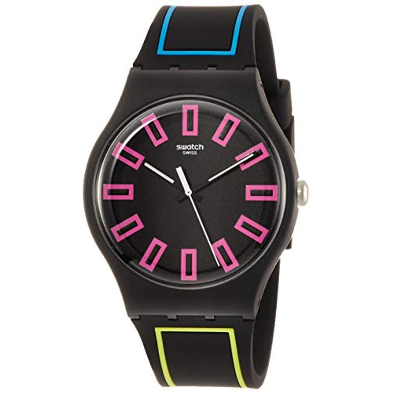 Swatch Herrenuhr Analog Quarzwerk Silikonband SUOB146Swiss Made, aus der Kollektion The Swatch Vibe, schwarzes Kunststoff-Gehäuse, geriffelte Krone, Kunststoffglas, wasserdicht geprüft bis 3 bar, Breite 41 mm, Höhe 9,85 mm, Armband aus schwarzem Silikon mit neongelbem und neonblauem Streifen, Dornschließe mit Logogravur, präzises Quarzwerk, schwarzes Zifferblatt, pinke Indexe, schwarze Leuchtzeiger, zentraler weißer Sekundenzeiger