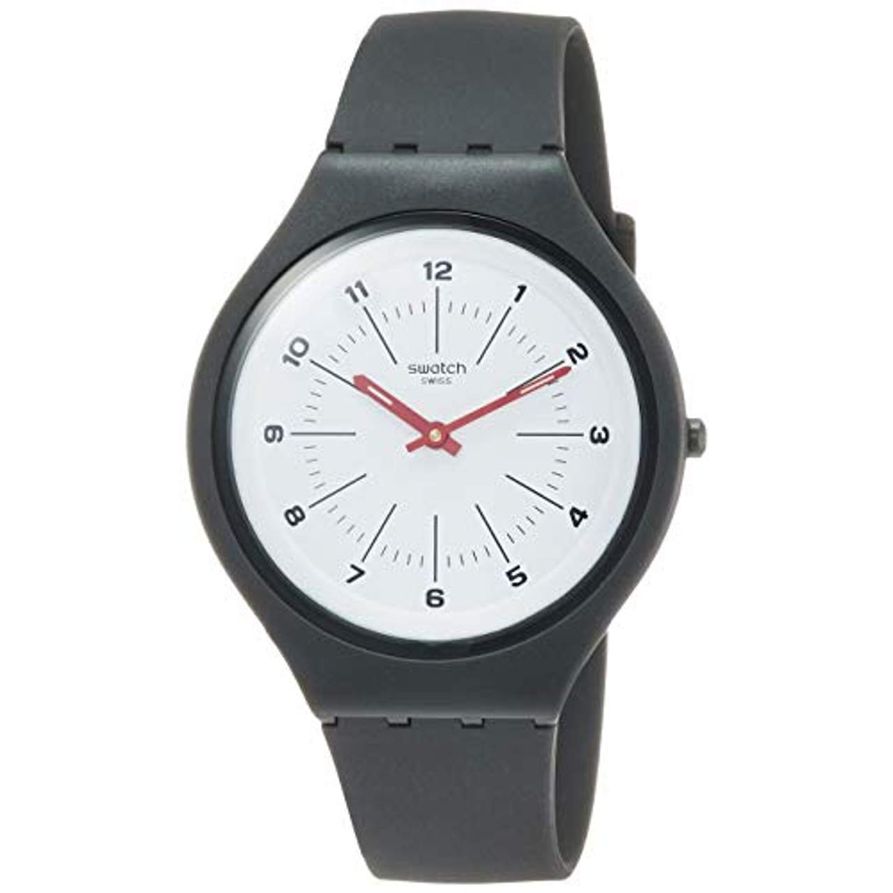 Swatch Unisex Erwachsene Analog Quarz Uhr SVUM104extraflache Uhr in Unisex-Größe, Swiss Made, aus der Kollektion New Skin, dunkelgraues Kunststoff-Gehäuse, Kunststoffglas, dunkelgraues Silikonarmband mit Dornschließe, präzises Quarzwerk, weißes Zifferblatt, rote Zeiger, schwarze Zahlen und Indizes, wasserdicht bis 3 bar, Durchmesser 40 mm, Höhe 5,7 mm