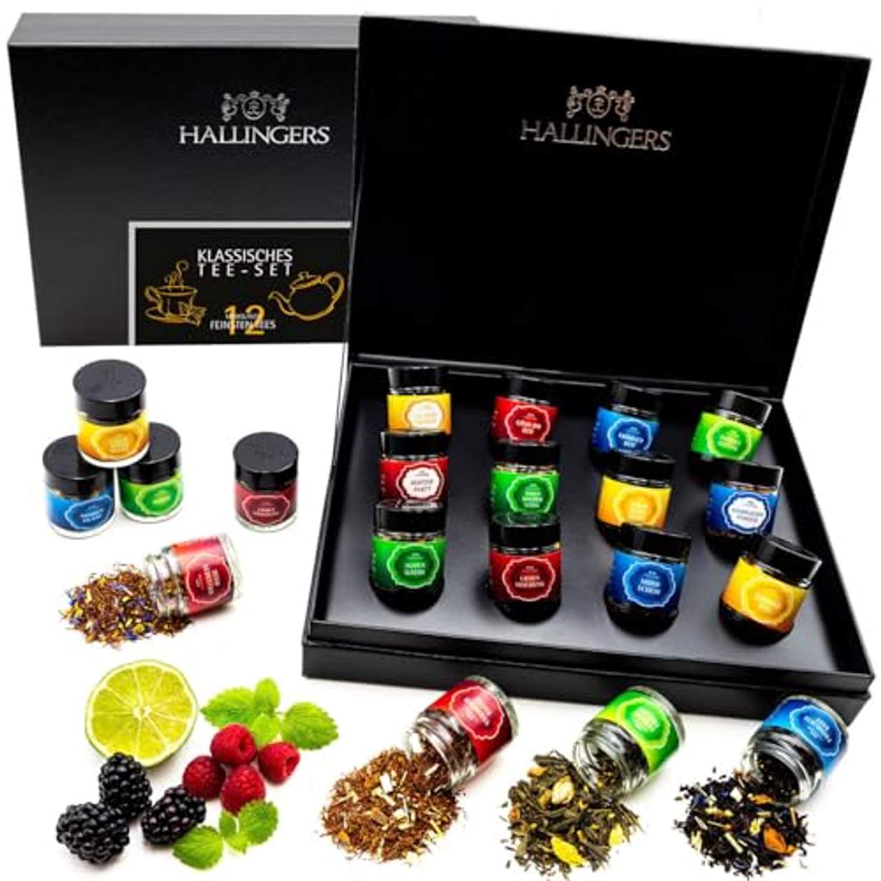 Hallingers 12er Tee-Geschenk-Set mit Tee aus aller WeltZwölf exklusive Tee-Sorten in stilvoller Sonder-Edition als Tee-Set oder als Tee-Geschenk zum Probieren. Edle Optik, höchster Genuss und Orginalität. Was braucht ein Gechenk mehr, um den liebsten oder guten Freunden ein strahlen ins Gesicht zu zaubern?Eine Prise Liebe. Dieses Tee-Set besteht aus zwölf mit Liebe ausgewählten und von Hand abgefüllten Teemischungen aus alle Welt - das Sortiment umfasst Früchtetee, Grüntee, Schwarztee, Roibostee, Detoxtee sowie Kräutertee. Die speziellen, wiederverschließbaren Mini-Gläschen erfreuen nicht nur das Auge, sonderen bewahren auch besonders lange das feine Aroma ihres Inhalts. Jedes 12er-Set wird von Hand in unserer Manufaktur konfektioniert.Das edle Design der Verpackung macht dieses Sammlung feinster Tees zu einem ästhetischen hingucker und ist ein perfektes, hochwertiges und originelles Geschenk.