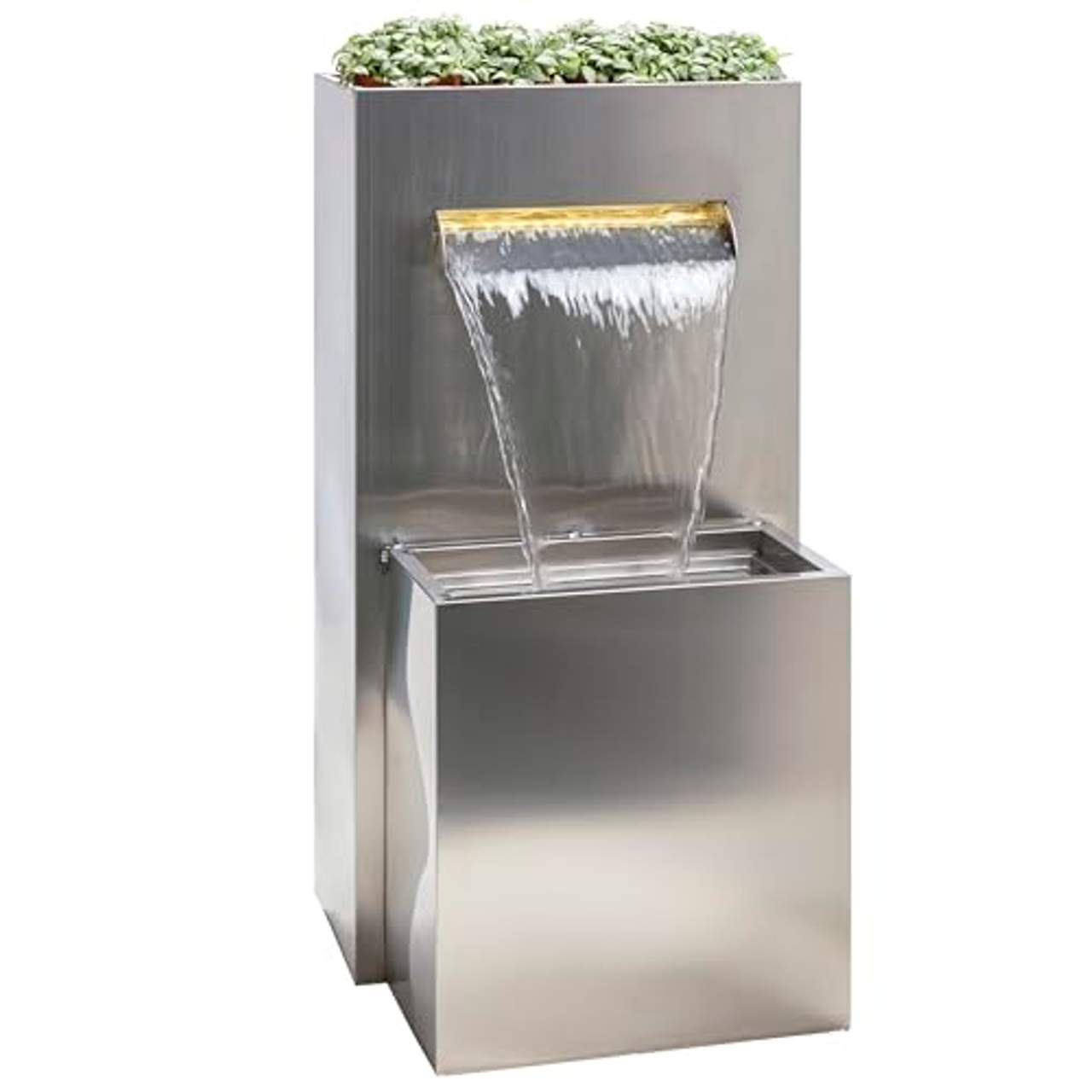 Dehner Gartenbrunnen Dallas mit LEDFasziniert mit einem imposanten Wasserfall:Dehner Edelstahl-Gartenbrunnen Dallas, ca. H89 cm Inkl. Pumpe, Trafo, warmweißer LED-Schlauch mit 20 Lichtern Ihr Garten grünt und blüht, aber es fehlt noch das gewisse Etwas? Ein Hingucker, der Ihre Passion für modernes Design und Ihre Leidenschaft für das Element Wasser perfekt kombiniert?Dann könnte der Dehner Edelstahl-Gartenbrunnen Dallas der richtige für Sie sein. Mit seiner modern geradlinigen Form und dem gebürsteten, sanft schimmernden Edelstahl ist der Brunnen ein modernes und doch stimmungsvolles Garten-Objekt. Denn aus dem höheren der beiden schlanken Kästen ergießt sich unaufhörlich ein imposanter Wasserfall mit einer nahezu geschlossenen Wasserwand.An schönen Sommertagen wird die Sonne für farbig glitzernde Reflexionen sorgen, am Abend taucht das warmweiße Licht des integrierten LED-Schlauchs den Wasserfall in ein magisches Licht. Welches Schauspiel spannender ist? Das entscheiden Sie, wenn der Dehner Edelstahl-Gartenbrunnen bei Ihnen steht.Exklusives Design-Objekt für Terrasse &, Garten Der Dehner Edelstahl-Gartenbrunnen Dallas arbeitet mit einem in sich geschlossenen Wasserkreislauf, so dass Sie seinen Standort unabhängig von einem Wasseranschluss wählen können. Ob auf der Terrasse, in einer Gartenecke, die Sie gerne aufsuchen oder als Solitär am Rande der Rasenfläche – wählen Sie einen Standort, an dem Sie das Wasserspiel immer gut sehen können. Ganz nach Ihrem persönlichen Geschmack können Sie auch die Pflanzen auswählen, die Sie oben in den Pflanzkasten des Brunnens setzen können. Aufrechtstehend oder hängend, grün oder farbenfroh – ganz, wie es Ihnen am besten gefällt. Der Brunnenkorpus besteht komplett aus hochwertigem, wetterfestem Edelstahl, sodass Sie ihn das ganze Jahr draußen stehen lassen können. Allerdings sollten Sie ihn vor Beginn des Winters entleeren, die Pumpe entnehmen und den Korpus abdecken.