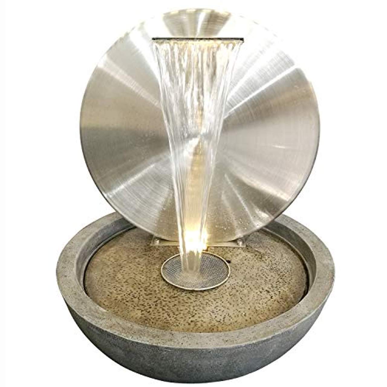 runde Wasserwand aus Edelstahl mit einer Halbschale in Natursteinoptik der Marke KÖHKO Pumpe (Betrieb über 230V Netzstecker) und LED-Beleuchtung (3 LEDs) Dekorationssteine sind nicht im Lieferumfang enthalten