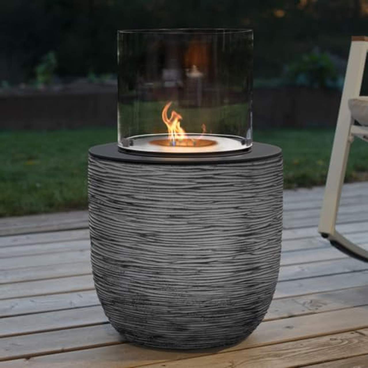 Die muenkel design Vagos Riffelung schwarz-grau ist eine stilvolle und dekorative Bioethanol-Feuerstelle, die speziell für den Einsatz im Freien entwickelt wurde. Sie erzeugt echte Flammen und verleiht jedem überdachten Außenbereich einen Hauch von Eleganz.